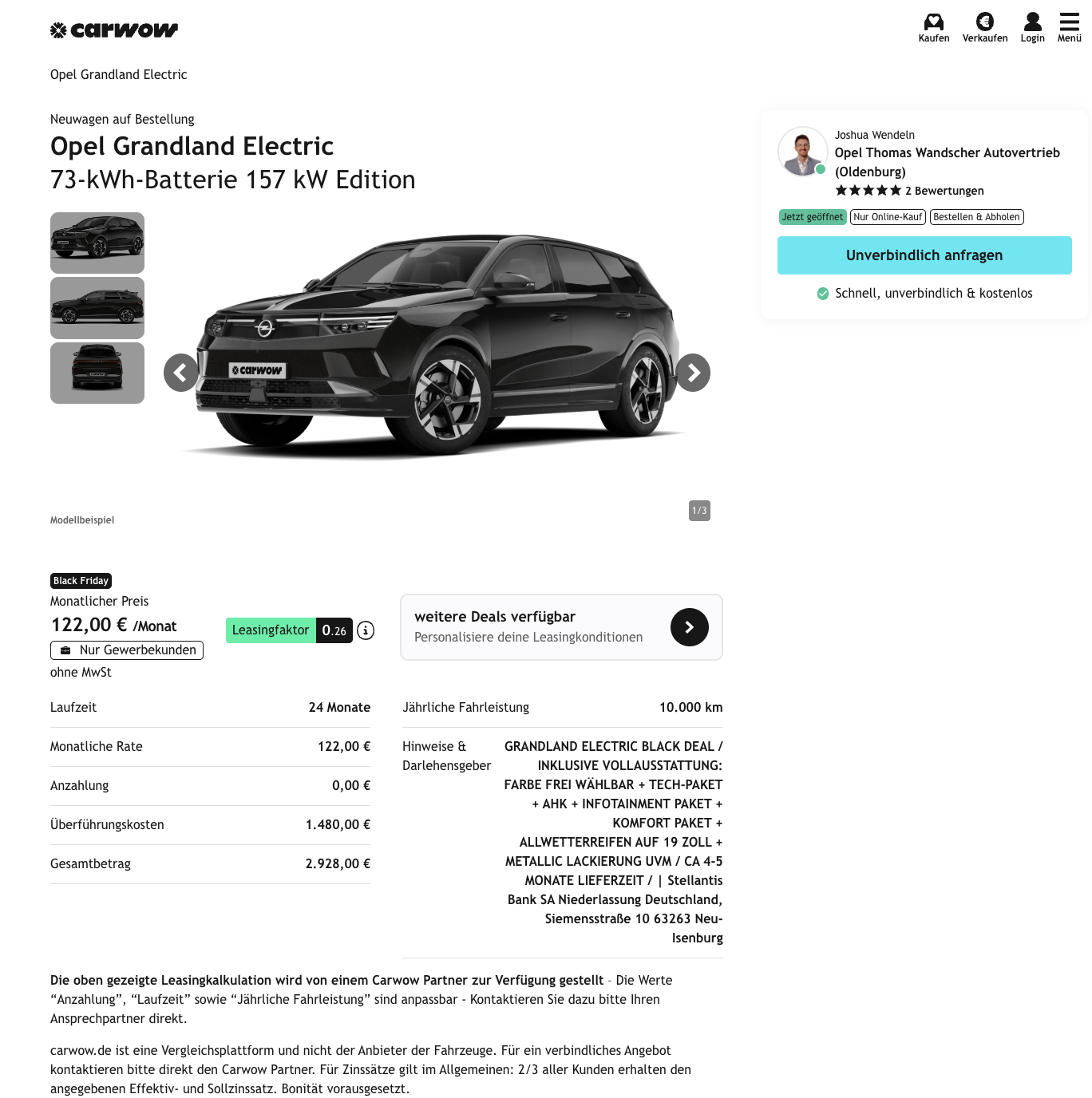 Ein Elektro-SUV zum Preis eines Kleinwagens im Flottenregal. Opel Grandland Electric 73 kWh 157 kW Edition bei carwow für nur 122 Euro netto im Monat, im Geschäftsleasing, mit frei wählbarer Farbe und einer Lieferzeit von etwa vier bis fünf Monaten. In dieser Konfiguration reden wir über ein vollwertiges Mittelklasse-SUV mit reichlich Platz, großer Reichweite und sehr kompletter Ausstattung, das preislich dort landet, wo sonst oft einfache Verbrenner aus der Kompaktklasse stehen.