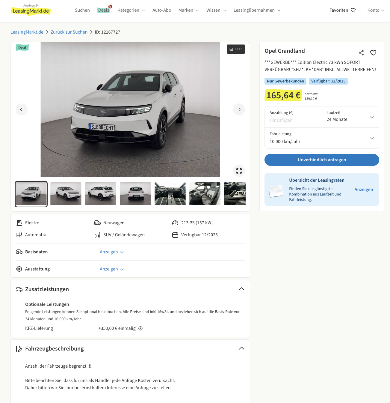 Wer gerade über einen Wechsel zum Stromer nachdenkt, bekommt hier eine ziemlich klare Chance. Der Opel Grandland Electric 73 kWh 157 kW Edition steht bei LeasingMarkt für 139,19 Euro netto im Monat im Geschäftsleasing, sofort verfügbar in Arktis Weiß und nur in begrenzter Stückzahl. Ein Leasingfaktor von 0,35 zeigt recht deutlich, wie aggressiv dieses Angebot kalkuliert ist.