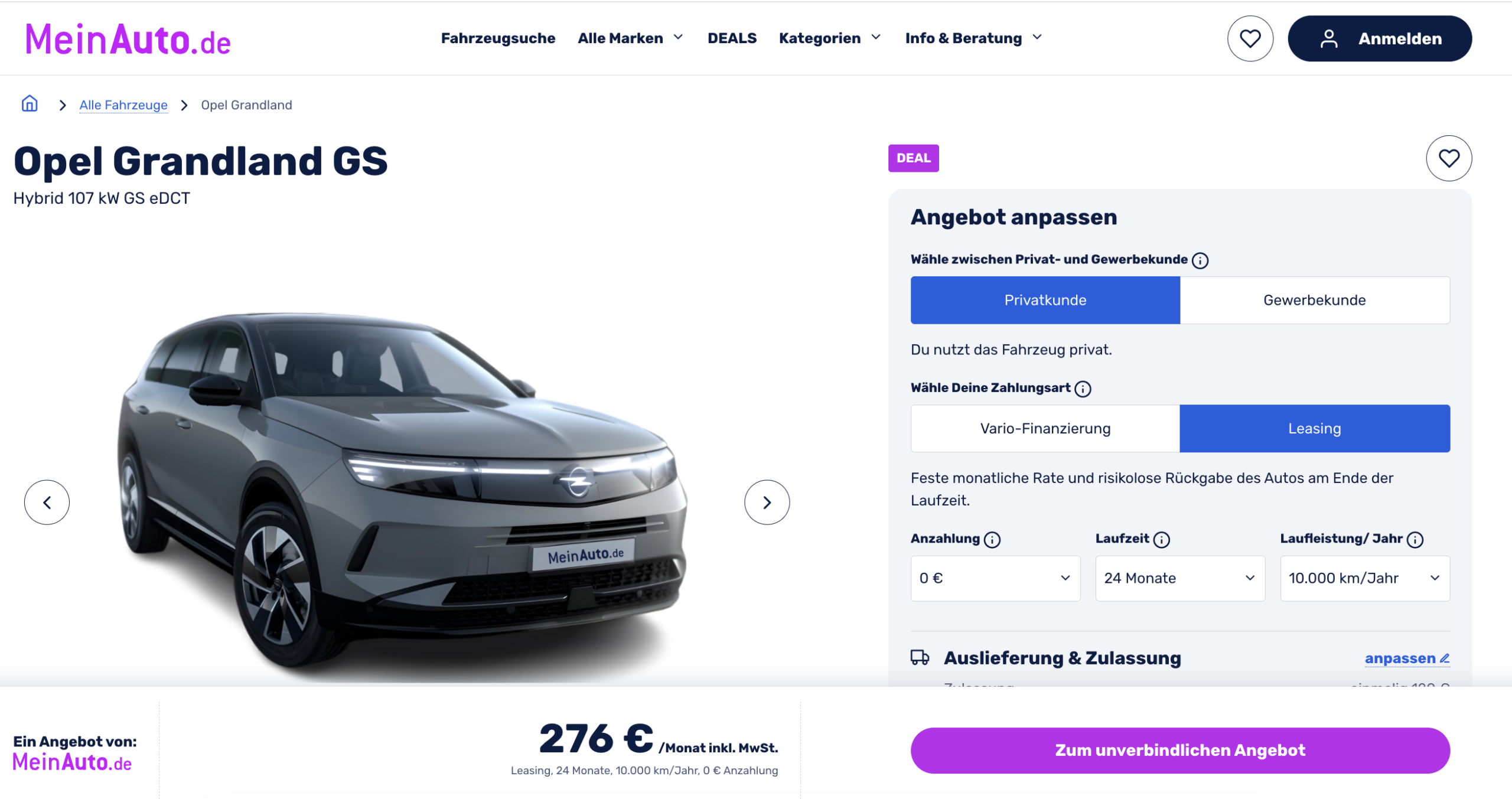 Der Opel Grandland gehört zu den SUV, die viel Platz, moderne Technik und eine angenehme Fahrcharakteristik miteinander verbinden. Opel Grandland Hybrid 107 kW eDCT GS bei MeinAuto.de für 276 Euro brutto im Monat zeigt, dass ein großes Kompakt-SUV nicht automatisch hohe Leasingraten bedeuten muss. Angeboten wird ein vorkonfiguriertes Fahrzeug, das bereits relativ kurzfristig verfügbar ist. Die Auslieferung ist aktuell ab Mai 2026 vorgesehen, was im Vergleich zu vielen Bestellfahrzeugen eine angenehm überschaubare Wartezeit darstellt.
