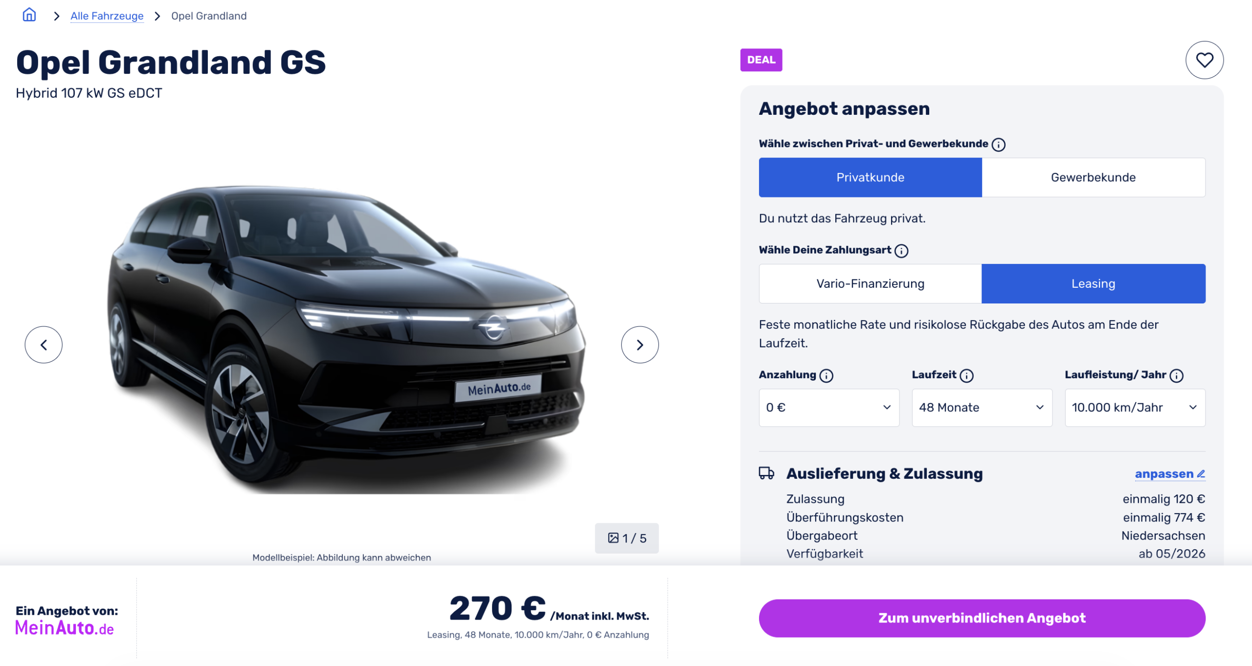 Die Konditionen basieren auf 48 Monaten Laufzeit und 10.000 Kilometern pro Jahr. Besonders interessant wird das Angebot im Vergleich. Während ein ähnlicher Grandland beim Marktführer bei rund 302 Euro brutto im Monat liegt, steht dieses Angebot bei 270 Euro.
