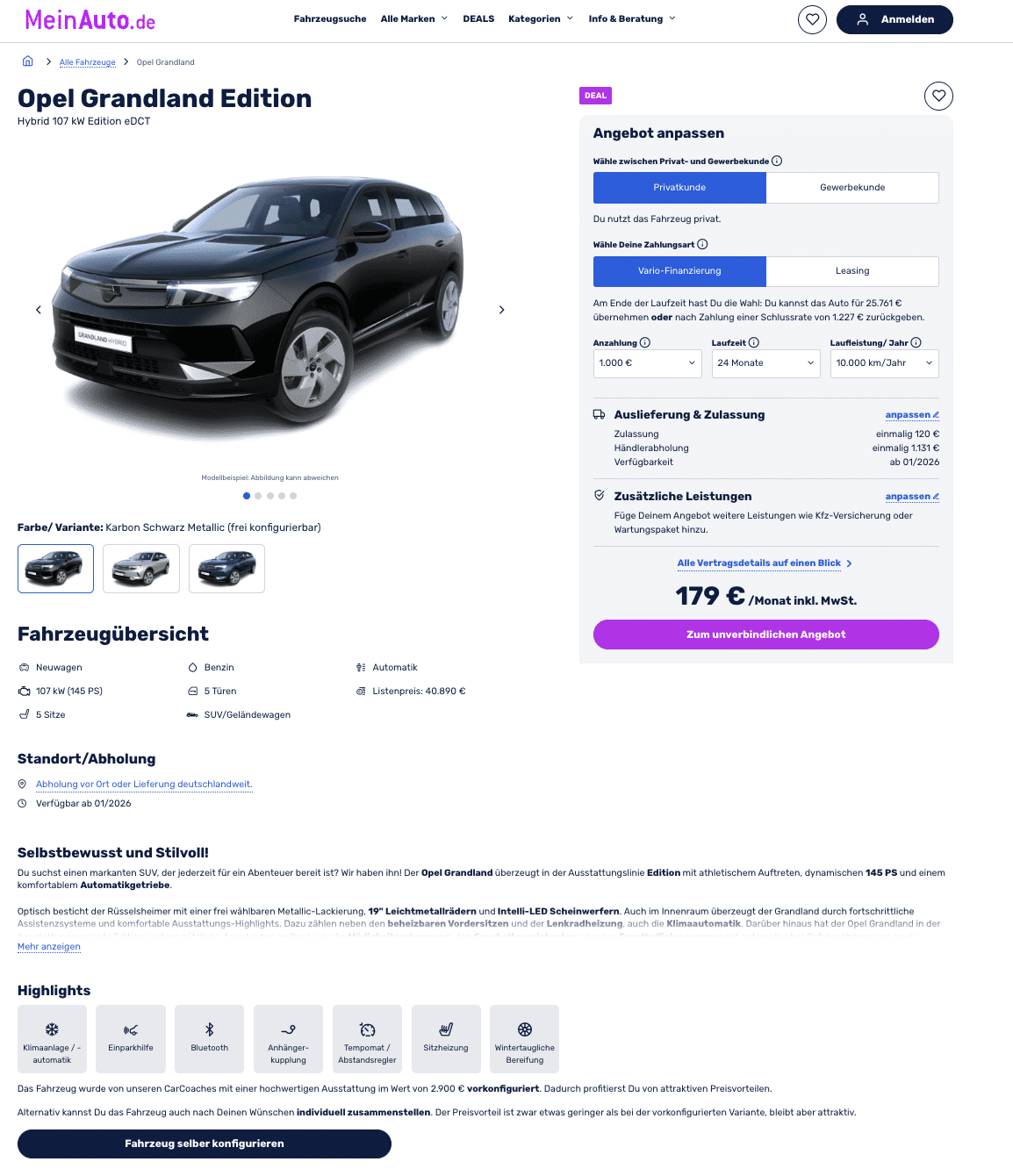 Bei MeinAuto startest du mit dem Opel Grandland Hybrid (136 PS) eDCT bereits ab 179 € brutto im Monat im Vario-Leasing, angesetzt mit 1.000 € Anzahlung. Das Prinzip bleibt maximal flexibel: Nach 24 Monaten könnt ihr wählen, ob ihr das SUV für 25.761 € übernehmt oder ihn nach einer Schlussrate von 1.227 € bequem zurückgebt. Wer stattdessen klassisch leasen möchte, findet dieselbe Konfiguration ab 224 € brutto/Monat. Der Grandland ist vorkonfiguriert und in Karbon Schwarz, Kristall Silber oder Spektrum Blau verfügbar.