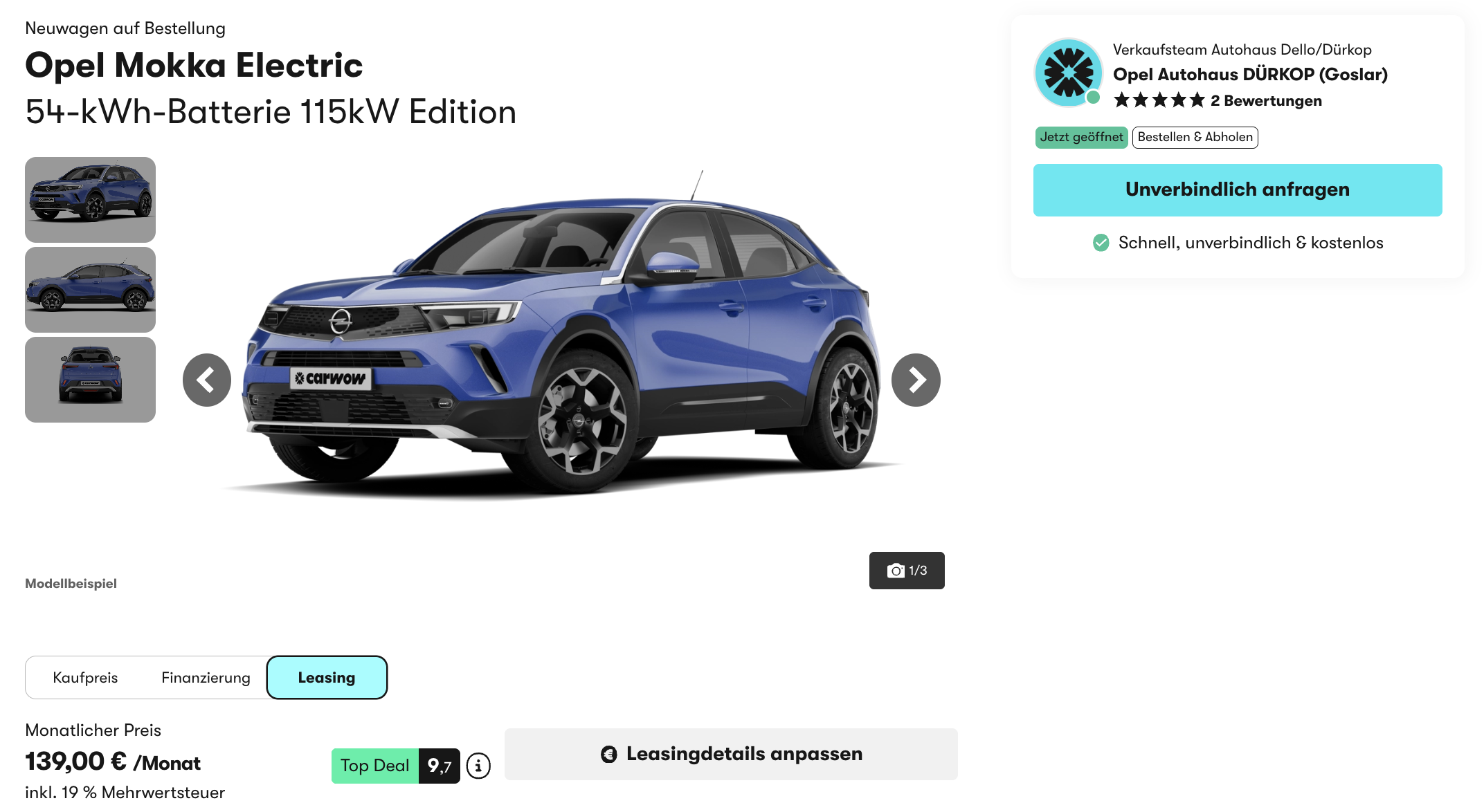 Opel Mokka-e im Leasing als Bestellfahrzeug für 139 (264) Euro im Monat brutto [Umwelt]