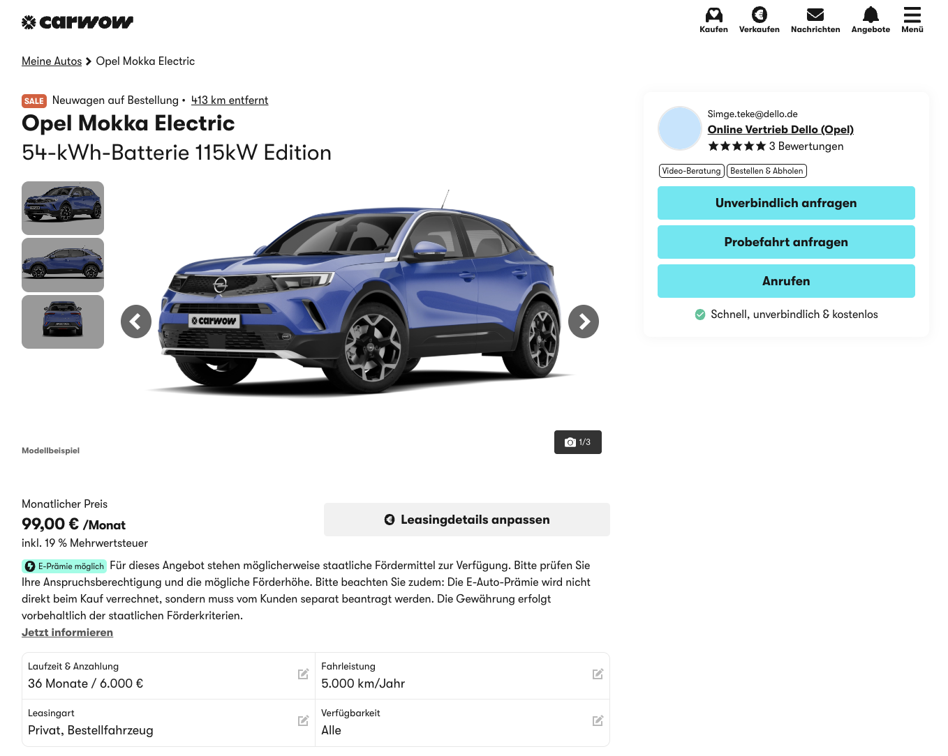 Der Einstieg in ein elektrisches SUV muss nicht automatisch teuer sein. Opel Mokka-e 54 kWh 115 kW Edition bei carwow für 99 Euro brutto im Monat zeigt genau das, auch wenn die niedrige Rate an eine Sonderzahlung von 6.000 Euro geknüpft ist. Diese wird im Rahmen der neuen Umweltprämie angesetzt und kann je nach Förderfähigkeit ganz oder teilweise zurückerstattet werden. Für eine realistische Bewertung sollte deshalb die umgerechnete Monatsrate betrachtet werden. Diese liegt bei 266 Euro brutto pro Monat. Das Fahrzeug wird als Bestellfahrzeug angeboten, die Lieferzeit beträgt rund vier bis fünf Monate, die Abholung erfolgt in Reinfeld bei Hamburg.