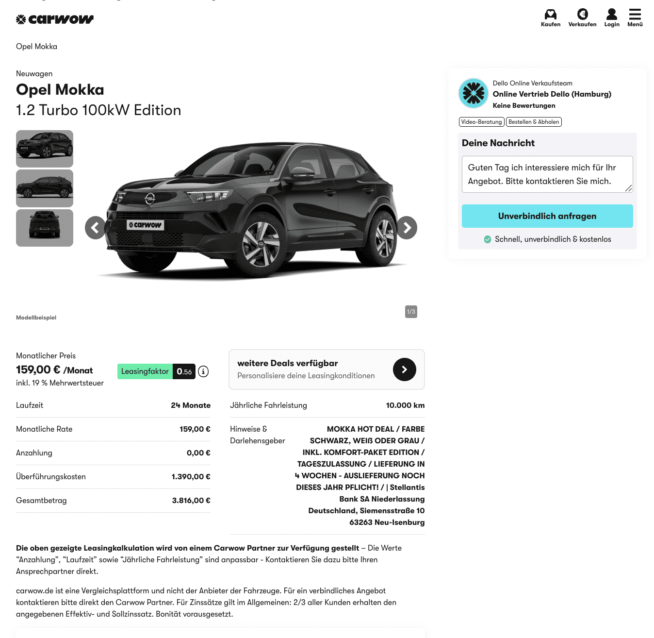 Kompakte Abmessungen, klare Kante im Design und ein Preis, der überrascht. Der Opel Mokka 1.2 Turbo 100 kW Edition steht bei carwow schon für 159 Euro brutto im Monat bereit. Der Neuwagen ist kurzfristig verfügbar, in nur vier Wochen, wahlweise in Schwarz, Weiß oder Grau. Für alle, die schnell einsteigen und direkt losfahren wollen, ist dieses Leasingangebot ein Volltreffer.