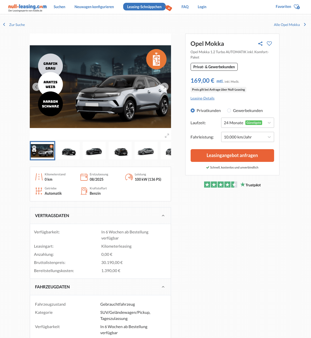 Das Angebot bei Null-Leasing wurde für 24 Monate Laufzeit und 10.000 Kilometer pro Jahr kalkuliert, lässt sich aber flexibel anpassen. Wer sich für den Mokka entscheidet, profitiert nicht nur von einem attraktiven Preis, sondern auch von einem sofort verfügbaren Fahrzeug – kein Warten, kein Aufpreis, einfach losfahren.