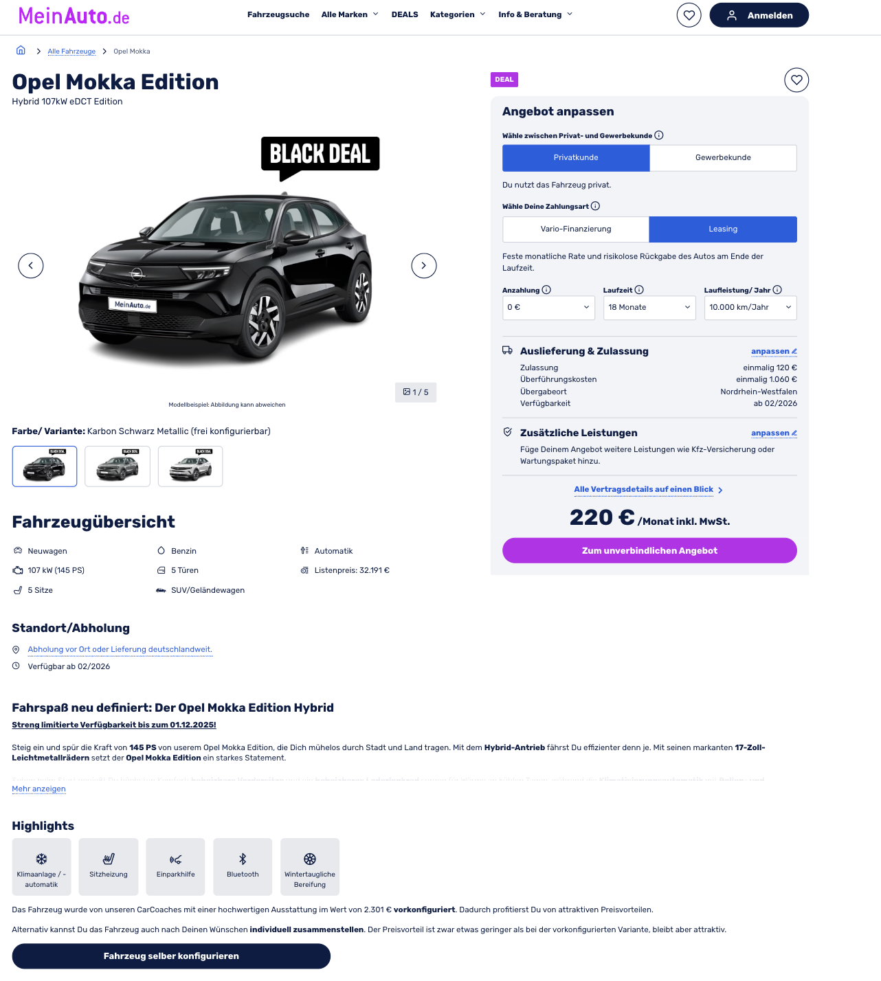 Das Leasing läuft über 18 Monate und 10.000 Kilometer pro Jahr, Anpassungen sind möglich. Zum Vergleich: Beim Marktführer liegt der monatliche Preis bei 276 Euro brutto, bei MeinAuto spart ihr also 56 Euro monatlich. Insgesamt bietet der Opel Mokka Hybrid Edition ein durchdachtes Gesamtpaket aus moderner Hybridtechnik, kompaktem Design und guter Ausstattung zu einem Preis, der sich im Segment sehen lassen kann.