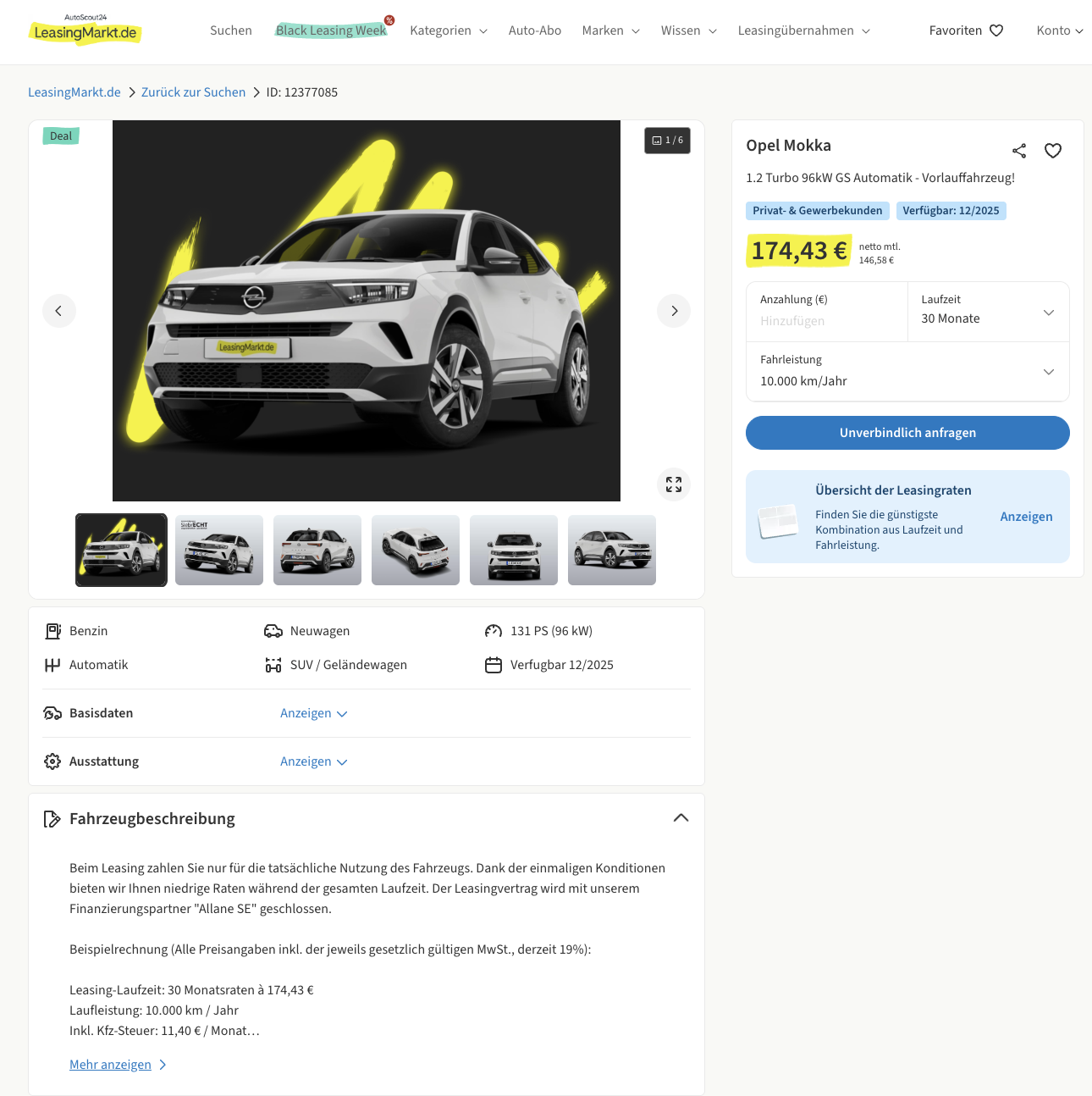 Ein kompaktes SUV mit Charakter und Automatik, ohne dass das Budget explodiert. LeasingMarkt präsentiert den Opel Mokka 1,2 Turbo 96 kW Automatik GS für nur 174,43 Euro brutto im Monat, als Vorlauffahrzeug mit geplanter Verfügbarkeit in 2025. Die Ausstattung ist bereits clever zusammengestellt, ihr steigt also in ein fertiges Paket ein, statt euch durch endlose Konfigurationen zu klicken. Das Ganze läuft im Privatleasing über 30 Monate mit 10.000 Kilometern pro Jahr, auf Wunsch lassen sich die Rahmendaten an euer Fahrprofil anpassen.