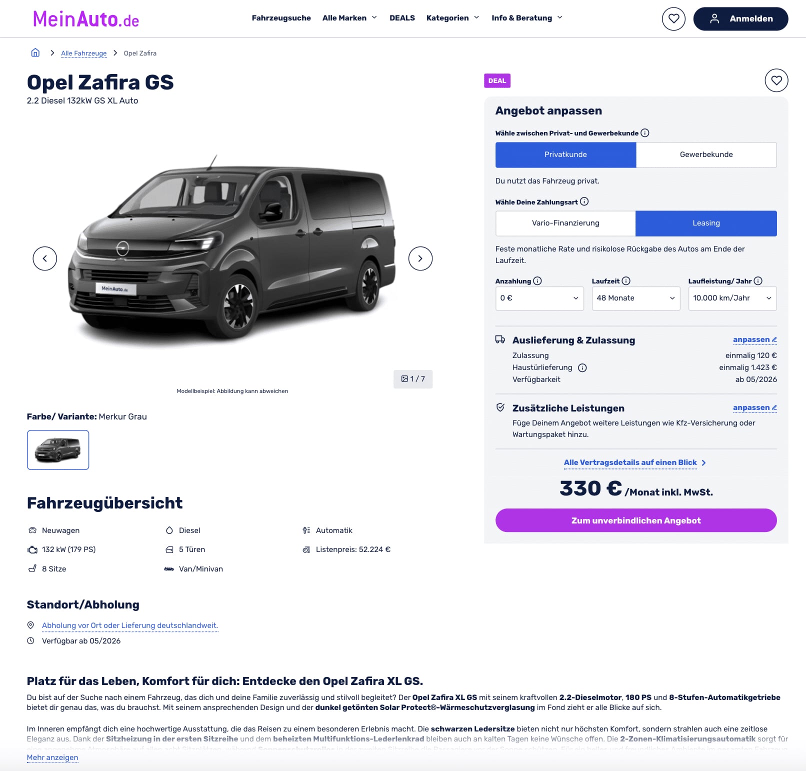 Das Angebot ist auf 48 Monate und 10.000 km Laufleistung pro Jahr kalkuliert, beides lässt sich an euren Bedarf anpassen. Der Blick ins Umfeld schärft den Vorteil, denn beim Platzhirsch stehen 395 Euro brutto pro Monat in der Zeile, bei MeinAuto zahlt ihr 330 Euro brutto. Ihr sichert euch also XL-Raum, GS-Komfort und Diesel-Effizienz zu Konditionen, die die Excel-Spalte entspannen und im Alltag jeden Kilometer leichter machen. Kurzer Nenner, viel Wirkung: großer Opel Zafira, klarer Preis, bereit für Familie, Team und Tour.