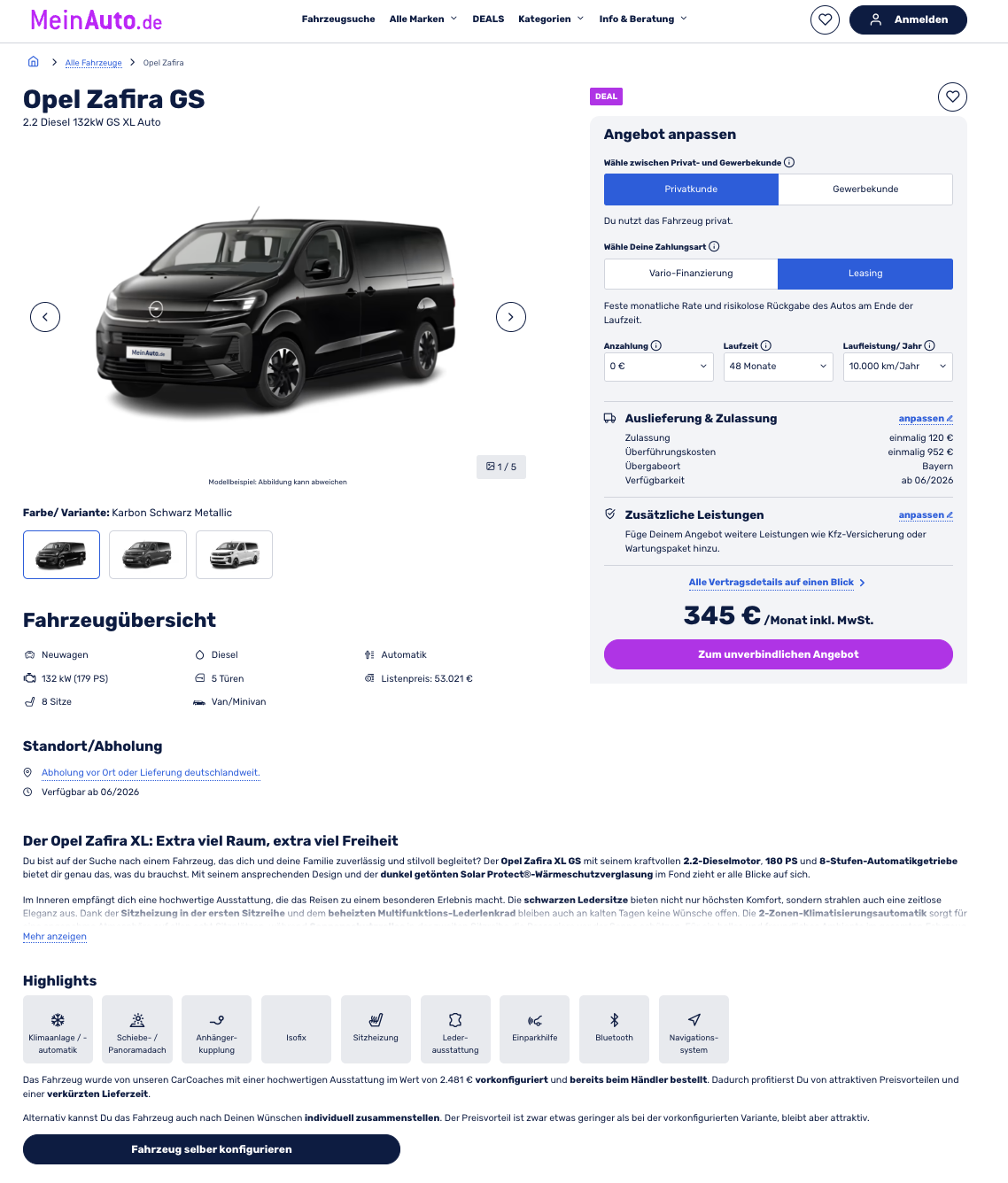 Wenn wirklich viele Menschen und viel Gepäck mit sollen, braucht es ein großes Fahrzeug. Den Opel Zafira 2.2 Diesel 132 kW Automatik XL GS könnt ihr aktuell bei MeinAuto für 345 Euro brutto im Monat leasen, vorkonfiguriert und ab Juni 2026 verfügbar. Optional lässt sich der Zafira bei MeinAuto auch frei konfigurieren, wenn Farbe oder Ausstattung genauer passen sollen.