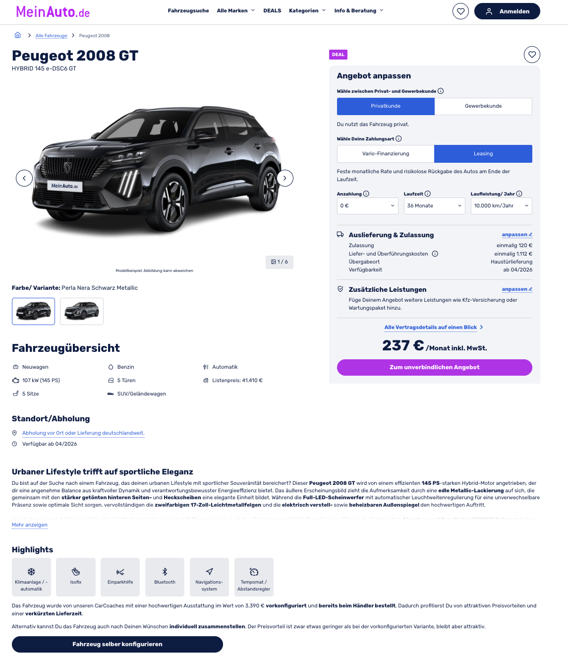 Wer ein modernes SUV im kompakten Format sucht und dabei Wert auf Optik und Technik legt, bekommt hier ein rundes Angebot. Peugeot 2008 Hybrid 145 e-DSC6 GT bei MeinAuto für 237 Euro im Monat brutto sichern. Es handelt sich um ein bereits bestelltes Fahrzeug, die Verfügbarkeit ist ab April 2026 vorgesehen. Farblich ist der 2008 GT in Perla Nera Schwarz Metallic oder Selenium Grau Metallic erhältlich.