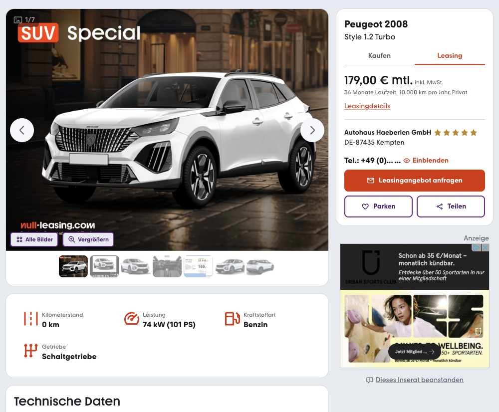 Die Kalkulation basiert auf 36 Monaten Laufzeit und 10.000 Kilometern jährlich, beides lässt sich bei Bedarf anpassen. Entscheidend ist jedoch der Vergleich, denn während ähnliche Angebote häufig bei rund 343 Euro brutto pro Monat liegen, bleibt dieser Deal mit 179 Euro brutto deutlich darunter.
