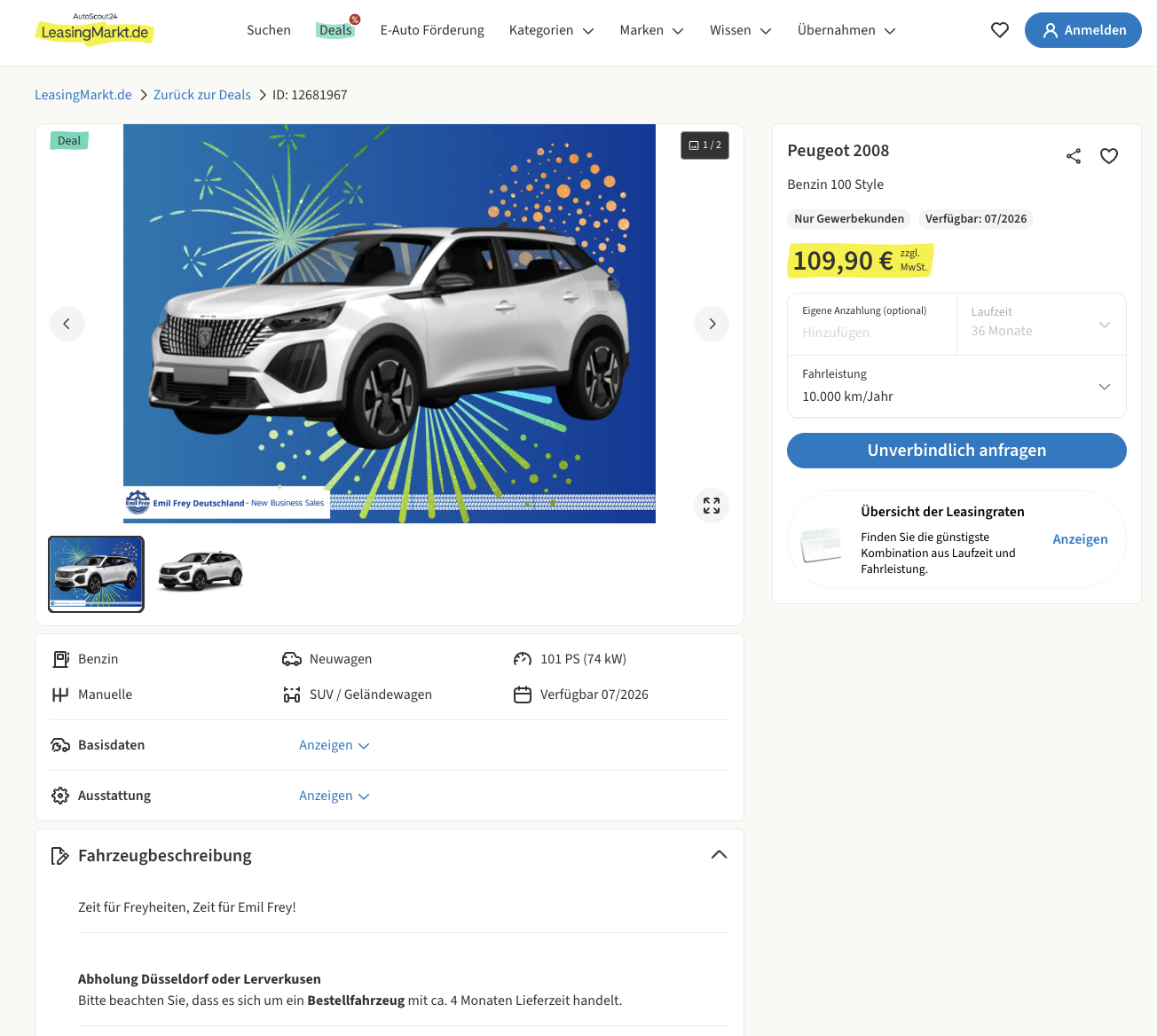 Ein kompaktes SUV im Geschäftsleasing muss vor allem eines leisten, im Alltag funktionieren, ohne das Budget unnötig zu belasten. Genau an dieser Stelle wird dieses Angebot interessant. Peugeot 2008 Turbo 100 Style bei LeasingMarkt für 109,90 Euro netto im Monat bringt ein modernes Crossover-Konzept zu einer Rate auf den Markt, die in dieser Klasse sofort ins Auge fällt. Dazu kommt ein weiterer Vorteil, denn es handelt sich nicht um einen starren Lagerwagen, sondern um eine Bestellaktion mit freier Konfiguration. Ausstattung, Farbe und Details lassen sich also passend zum eigenen Bedarf zusammenstellen. Die geplante Auslieferung im Juli 2026 macht das Angebot zudem gut planbar.