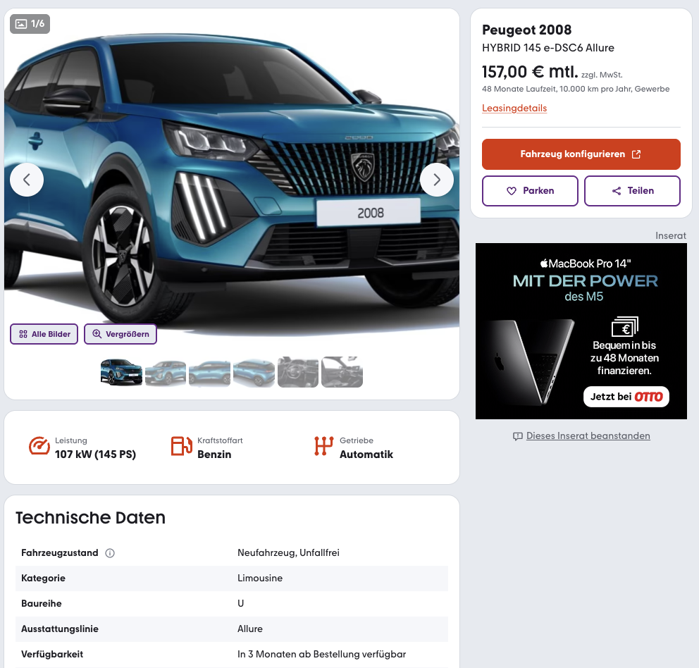 Peugeot 2008 Hybrid im Business-Leasing mit effizientem Antrieb. Bei mobile.de gibt es den Peugeot 2008 Hybrid 145 e-DSC6 Allure für 157 Euro netto im Monat und richtet sich an Geschäftskunden, die ein effizientes Mild-Hybrid-Fahrzeug mit solider Ausstattung suchen. Das 2008 wird als frei konfigurierbares Bestellfahrzeug angeboten, die Lieferzeit liegt bei etwa drei Monaten.