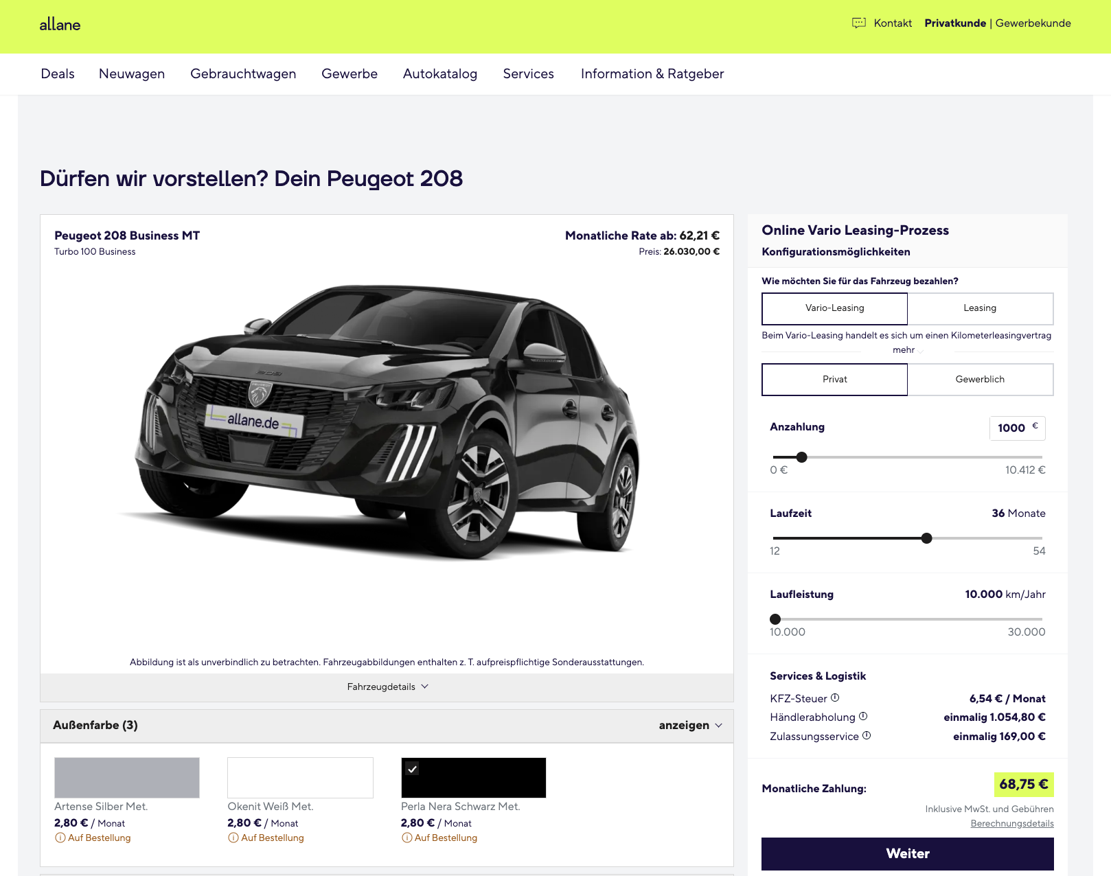 Der Peugeot 208 zeigt, dass ein moderner Kleinwagen nicht teuer sein muss. Peugeot 208 Turbo 100 Business bei Allane für 68,75 Euro brutto im Monat bringt einen kompakten Franzosen zu einer Rate auf die Straße, die klar unter der 100-Euro-Marke liegt. Kalkuliert wurde mit 1.000 Euro Anzahlung, 36 Monaten Laufzeit und 10.000 Kilometern pro Jahr. Das Fahrzeug ist bereits bestellt, die Lieferzeit liegt bei rund vier Monaten. Zur Wahl stehen Artense Silber, Okenit Weiß und Perla Nera Schwarz.