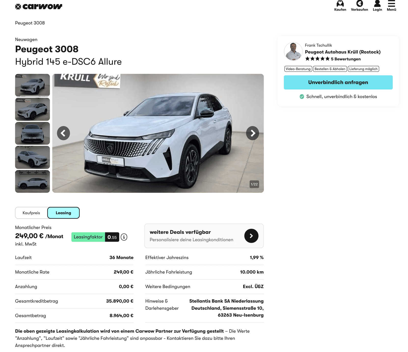Hinterlegt ist eine Laufzeit von 36 Monaten mit 10.000 km pro Jahr, beides lässt sich auf Wunsch anpassen. Der Blick über den Tellerrand zeigt, wie stark der Deal ist: Der Marktführer ruft für den 3008 aktuell 505 € brutto pro Monat auf. Der Lagerwagen ab 249 € halbiert die Hürde in etwa und spart Monat für Monat bares Geld.