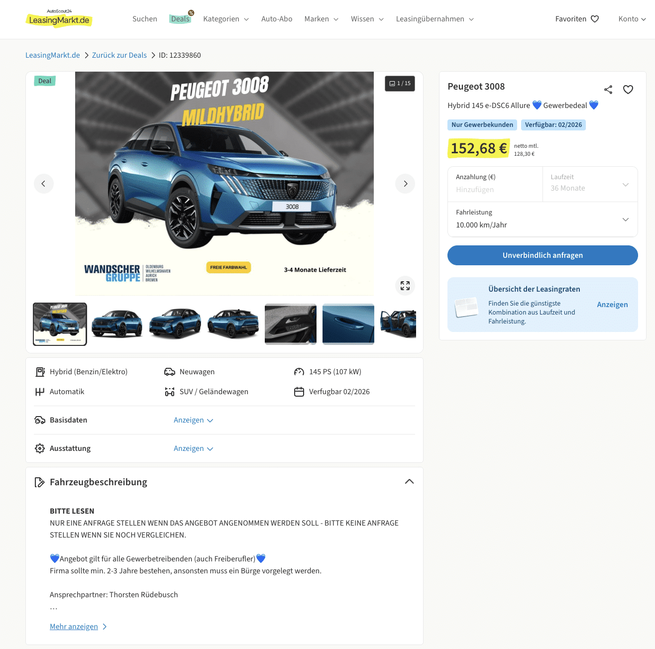 Die Kalkulation steht auf 36 Monaten Laufzeit und 10.000 Kilometern pro Jahr, Anpassungen sind möglich, wenn euer Profil anders aussieht. Preislich setzt ihr ein Ausrufezeichen, der Marktführer verlangt aktuell etwa 257 Euro netto pro Monat, hier zahlt ihr 128,30 Euro netto, das ist weniger als die Hälfte und lässt Raum für sinnvolle Extras. So kombiniert der Peugeot 3008 Hybrid 145 e-DSC6 Allure ein hochwertiges Ambiente, ein digitales, intuitives Bedienkonzept und einen effizienten Mildhybrid Antrieb mit einem Kurs, der im Segment heraussticht. Wer jetzt konfiguriert, sichert sich den Preis und die Ausstattung, die wirklich zählt.