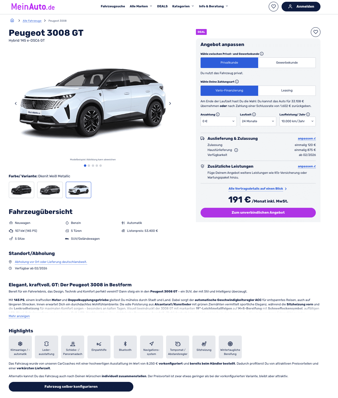 Es gibt Autos, die sind reine Fortbewegungsmittel. Und es gibt den Peugeot 3008 Hybrid GT, ein SUV, das den Alltag stylischer, smarter und entspannter macht. Bei MeinAuto gibt es den Franzosen jetzt im Vario-Leasing schon für 191 Euro brutto im Monat. Mit an Bord: Sonderausstattungen im Wert von satten 8.250 Euro, darunter das Winter-Paket, Komfort-Paket, Drive Assist Plus und das Sound&Air-Paket. Geliefert wird der 3008 ab Februar 2026, wahlweise in Okenit Weiß, Titan Grau oder Perla Nera Schwarz.