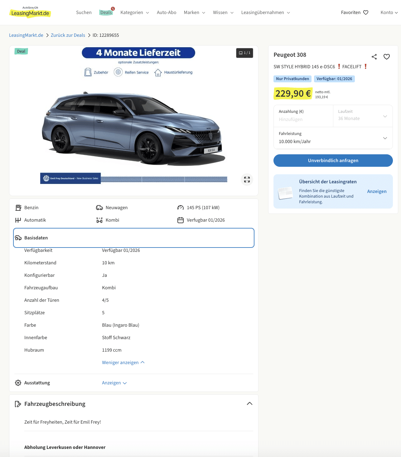 Wenn Alltag plötzlich nach Stil aussieht, dann sitzt ihr vermutlich im neuen Peugeot 308 SW Hybrid 145 e-DSC6 Style. Das frisch geliftete Modell bringt französische Raffinesse, moderne Hybridtechnik und eine ordentliche Portion Coolness auf die Straße. Bei LeasingMarkt gibt es den eleganten Kombi bereits für 229,90 Euro brutto im Monat, im Privatleasing. Das Fahrzeug ist ab Januar 2026 verfügbar, und wer möchte, kann mit einer Wunschlackierung oder einer Anhängerkupplung für je 7 Euro im Monat noch einen persönlichen Akzent setzen.