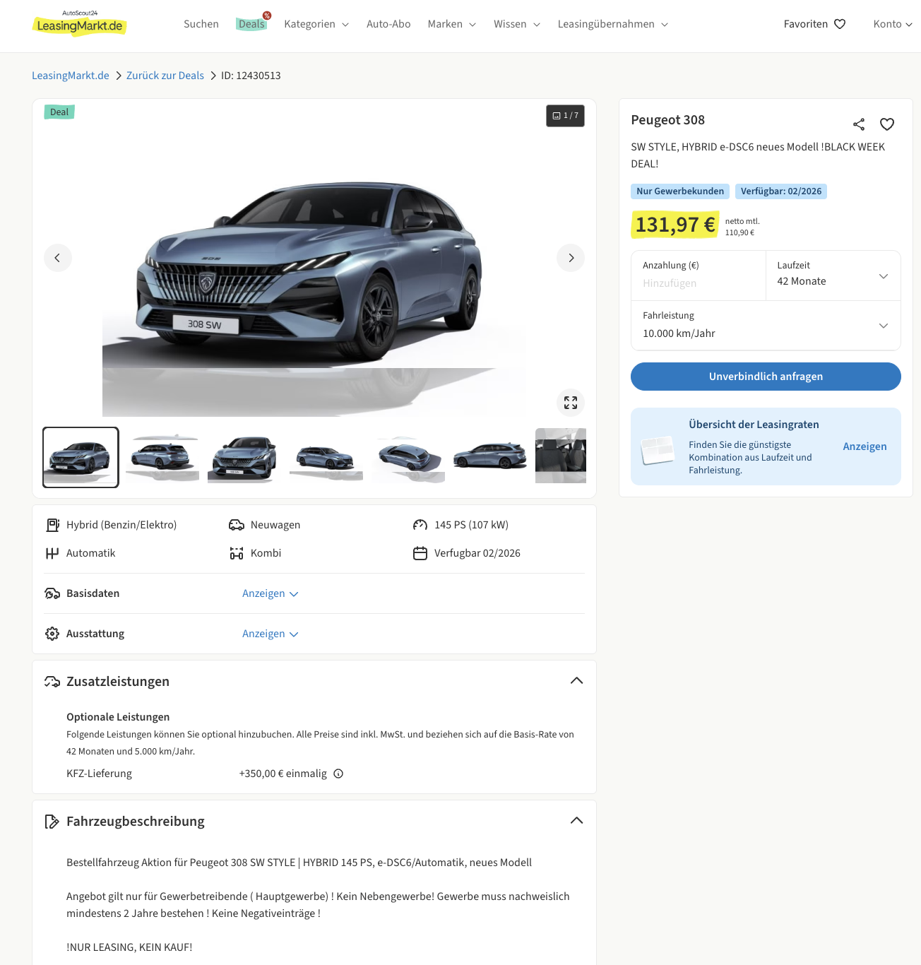 Das Leasing ist auf 42 Monate und 10.000 Kilometer pro Jahr ausgelegt, die Kilometerleistung lässt sich an euer Fahrprofil anpassen. Spannend wird der Blick zum Vergleich: Der Marktführer ruft für das gleiche Modell 199 Euro netto im Monat auf, bei LeasingMarkt liegen 111 Euro netto auf dem Tisch. So verbindet der Peugeot 308 SW Hybrid 145 e-DSC6 Style auffälliges Design, effizienten Hybridantrieb und viel Platz mit einer Rate, die im Fuhrparkbudget angenehm unaufgeregt bleibt.