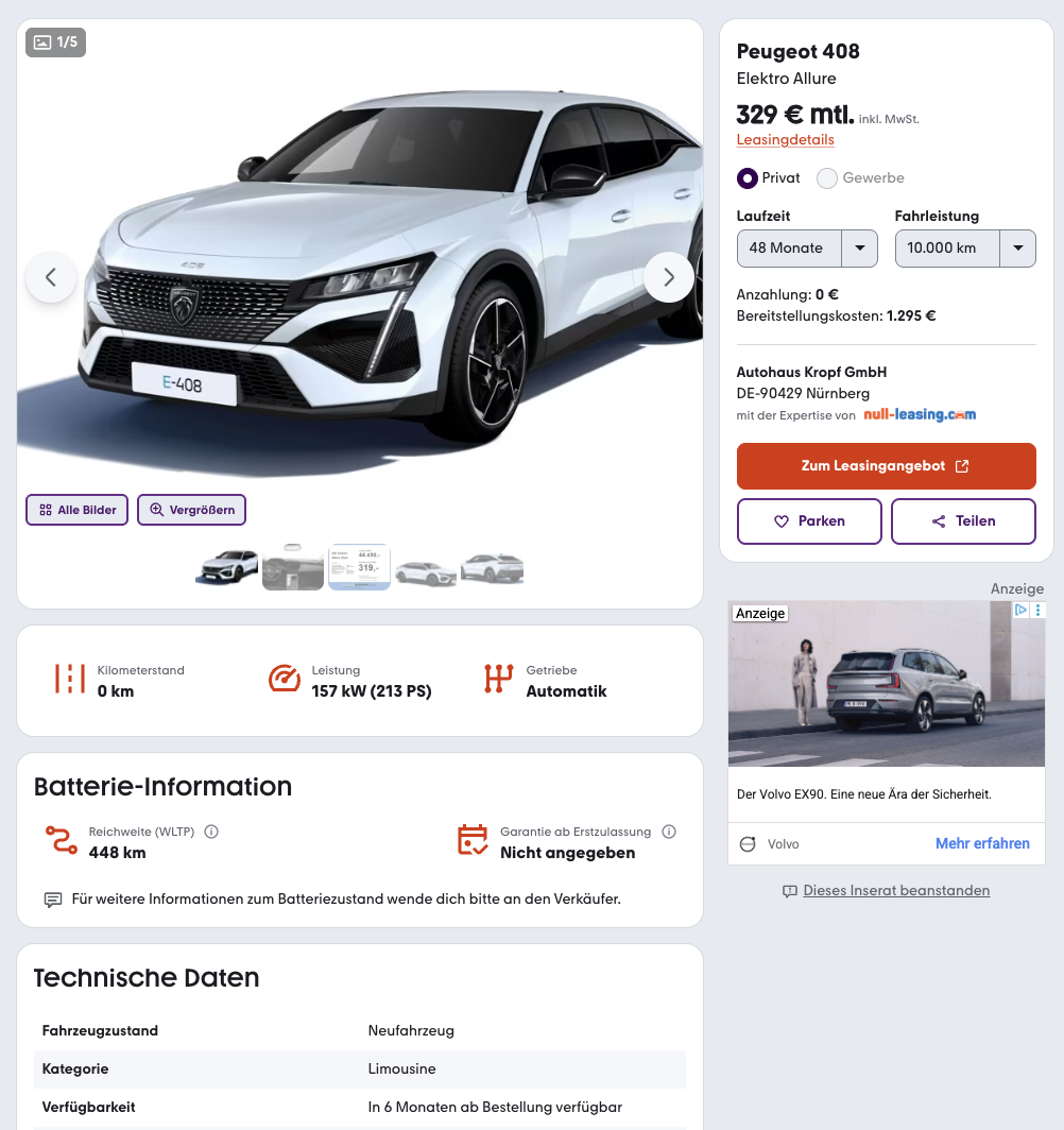 Ein elektrischer Fastback, der den Einstieg in die E-Mobilität leicht macht. Bei mobile.de gibt es den Peugeot 408 Elektromotor 210 Allure im Privatleasing für 329 Euro brutto im Monat, frei konfigurierbares Bestellfahrzeug mit etwa sechs Monaten Lieferzeit.
