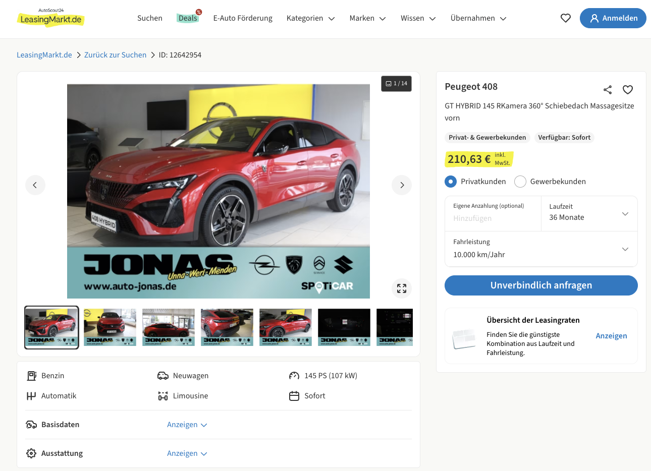 Kalkuliert wurde das Leasing mit 36 Monaten Laufzeit und 10.000 Freikilometern pro Jahr. Beides lässt sich anpassen. Besonders stark wirkt der Preis im Vergleich, denn beim Marktführer kostet ein ähnlich ausgestatteter Peugeot 408 aktuell 642 Euro brutto im Monat.