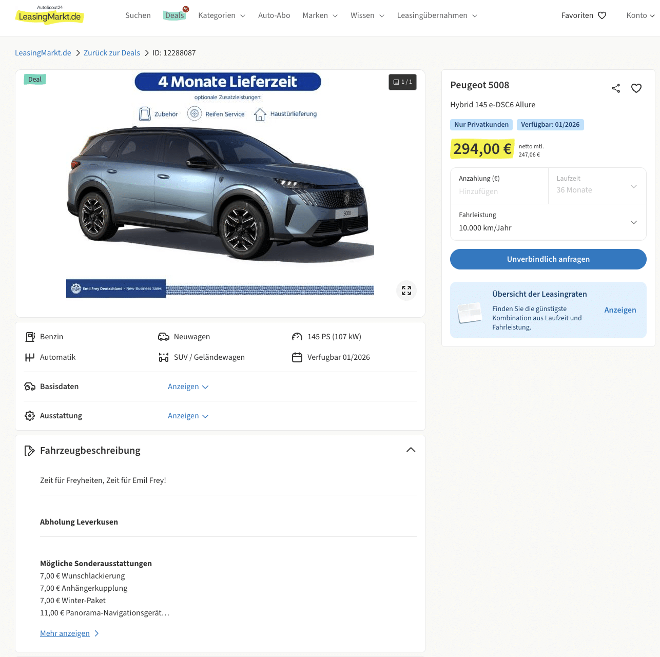 Das Angebot ist auf 36 Monate Laufzeit bei 10.000 Kilometern jährlich ausgelegt, lässt sich jedoch in Sachen Laufleistung anpassen. Im Vergleich zum Marktführer, der den gleichen 5008 Hybrid für 534 Euro brutto im Monat anbietet, spart ihr hier deutlich, über 240 Euro monatlich bleiben im eigenen Portemonnaie.