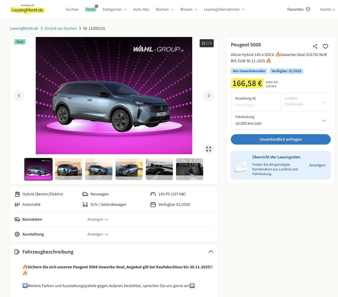 Das Beispiel bei LeasingMarkt ist mit 24 Monaten Laufzeit und 10.000 km pro Jahr kalkuliert, beides lässt sich an euren Bedarf anpassen. Der Blick nebenan macht den Unterschied sichtbar, der Marktführer listet denselben 5008 Hybrid mit 253 Euro netto pro Monat, hier zahlt ihr 139,98 Euro netto. Mehr als 110 Euro Ersparnis pro Monat bei identischer Technik und Segmentgröße.