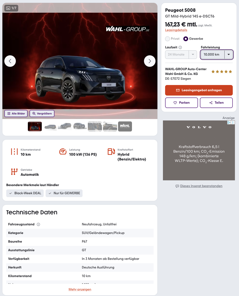 Kurz und klar, hier trifft viel Auto auf schlanke Rate. Peugeot 5008 Hybrid 145 e-DSC6 GT bei mobile.de für 167,30 Euro netto im Geschäftsleasing, 24 Monate Laufzeit mit 10.000 Kilometern pro Jahr, Verfügbarkeit etwa drei Monate nach Bestellung. Ein Angebot für alle, die Raum, Ruhe und moderne Hybridtechnik suchen, ohne das Budget zu sprengen.