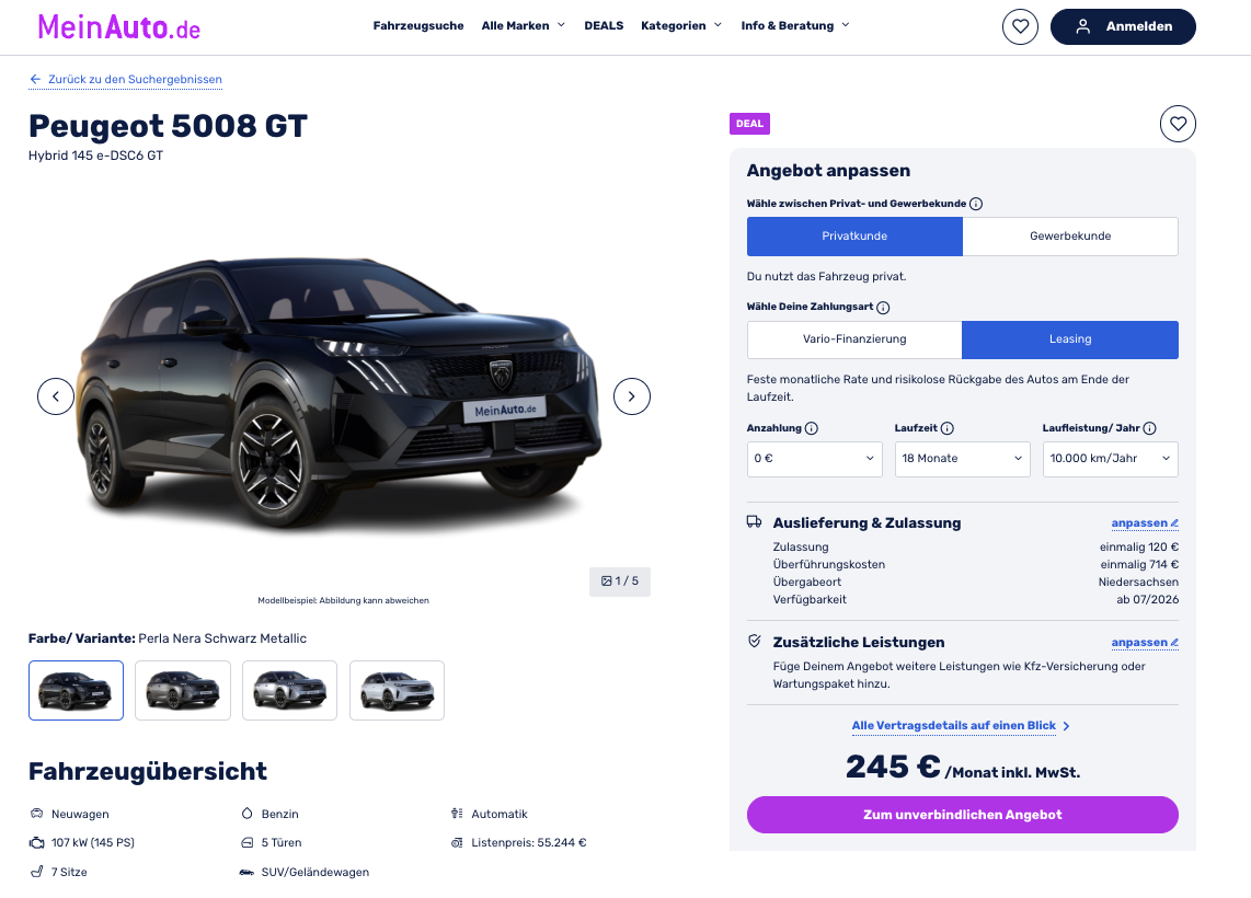 Die Leasingkalkulation basiert auf 18 Monaten Laufzeit und 10.000 Kilometern pro Jahr, Anpassungen sind meist möglich. Besonders interessant wirkt das Angebot im direkten Vergleich. Während andere Anbieter für einen ähnlich ausgestatteten Peugeot 5008 teilweise über 1.000 Euro brutto monatlich verlangen, bleibt dieser Deal mit 245 Euro brutto im Monat deutlich darunter.
