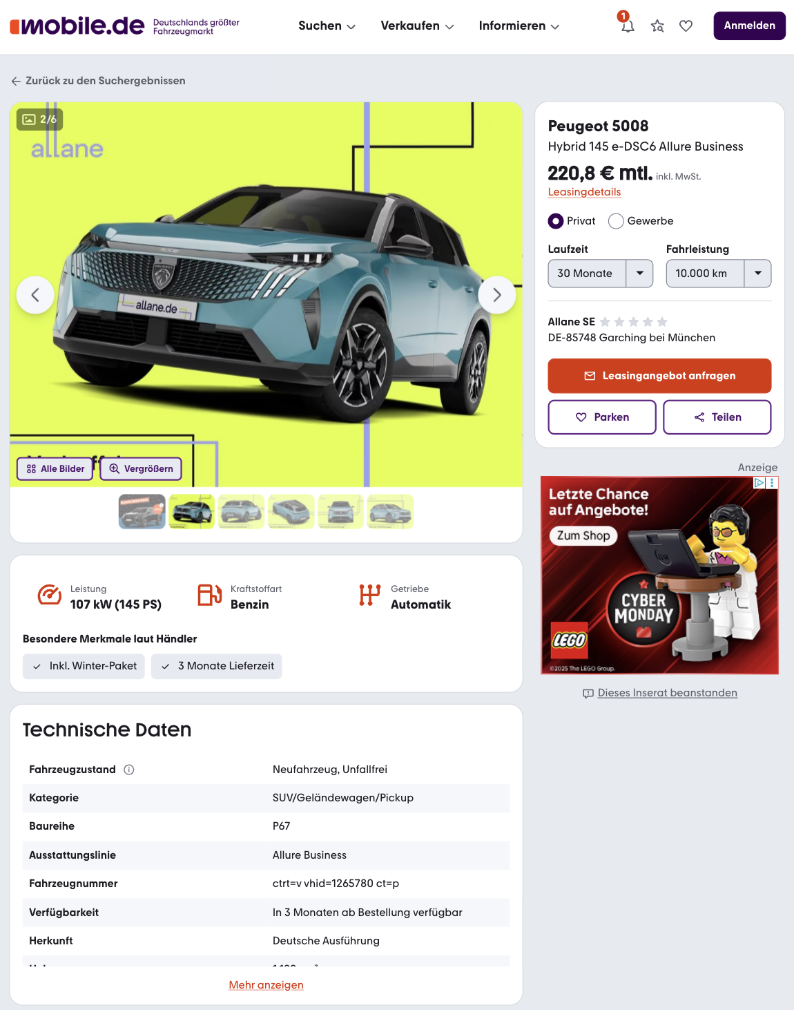 Der Peugeot 5008 zeigt, wie viel Auto in eine monatliche Rate passt. Peugeot 5008 Hybrid 145 e-DSC6 Allure Business bei mobile.de für 221 Euro brutto im Monat im Vario-Leasing. Die Laufzeit liegt bei 30 Monaten mit 10.000 Kilometern pro Jahr, die Lieferzeit beträgt rund drei Monate. Am Ende habt ihr die Wahl, entweder ihr übernehmt den 5008 für 25.793,60 Euro oder ihr gebt ihn zurück und begleicht lediglich die Schlussrate von 1.381,80 Euro. So bleibt ihr finanziell und planerisch flexibel.