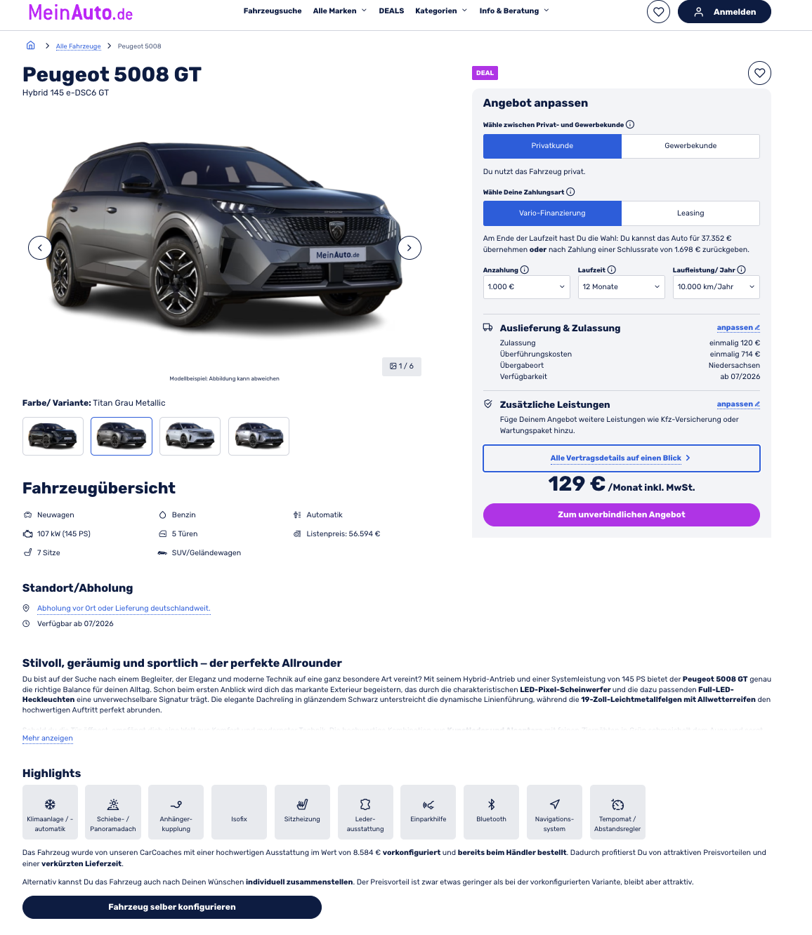 Wer ein geräumiges SUV mit sieben Sitzen sucht und dabei eine möglichst niedrige Monatsrate im Blick hat, bekommt hier ein außergewöhnliches Angebot. Peugeot 5008 Hybrid 145 e-DSC6 GT bei MeinAuto im Vario-Leasing für 129 Euro im Monat brutto ist ein Deal, der durch die Kombination aus Preis, Ausstattung und Flexibilität auffällt. Der Leasingfaktor liegt bei 0,38, was in dieser Fahrzeugklasse selten so günstig kalkuliert ist. Berechnet ist das Angebot mit 1.000 Euro Anzahlung, 12 Monaten Laufzeit und 10.000 Kilometern pro Jahr. Am Ende bleibt ihr flexibel, entweder wird der 5008 für 37.352 Euro übernommen, oder ihr gebt ihn nach Zahlung einer Schlussrate von 1.698 Euro zurück.