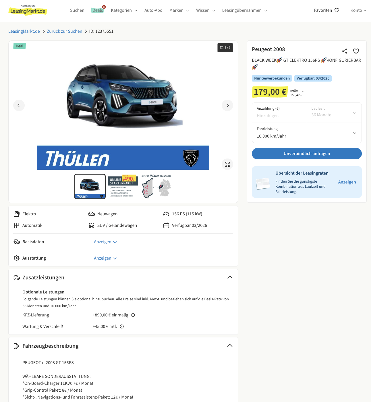 Das Angebot bei carwow ist auf 36 Monate Laufzeit und 10.000 Kilometer pro Jahr ausgelegt, Anpassungen sind möglich, ohne den Charakter des Deals zu zerstören. Entscheidend ist der Blick auf den Vergleich. Während der Marktführer aktuell rund 372 Euro netto im Monat für einen vergleichbaren e-2008 aufruft, liegt ihr hier bei 150,42 Euro netto. Der Abstand ist deutlich, der Gegenwert hoch, die monatliche Belastung überschaubar. So wird der Peugeot e-2008 156 GT zu einem elektrischen Geschäftsfahrzeug, das sowohl in der Excel-Tabelle als auch im Alltag eine sehr gute Figur macht.