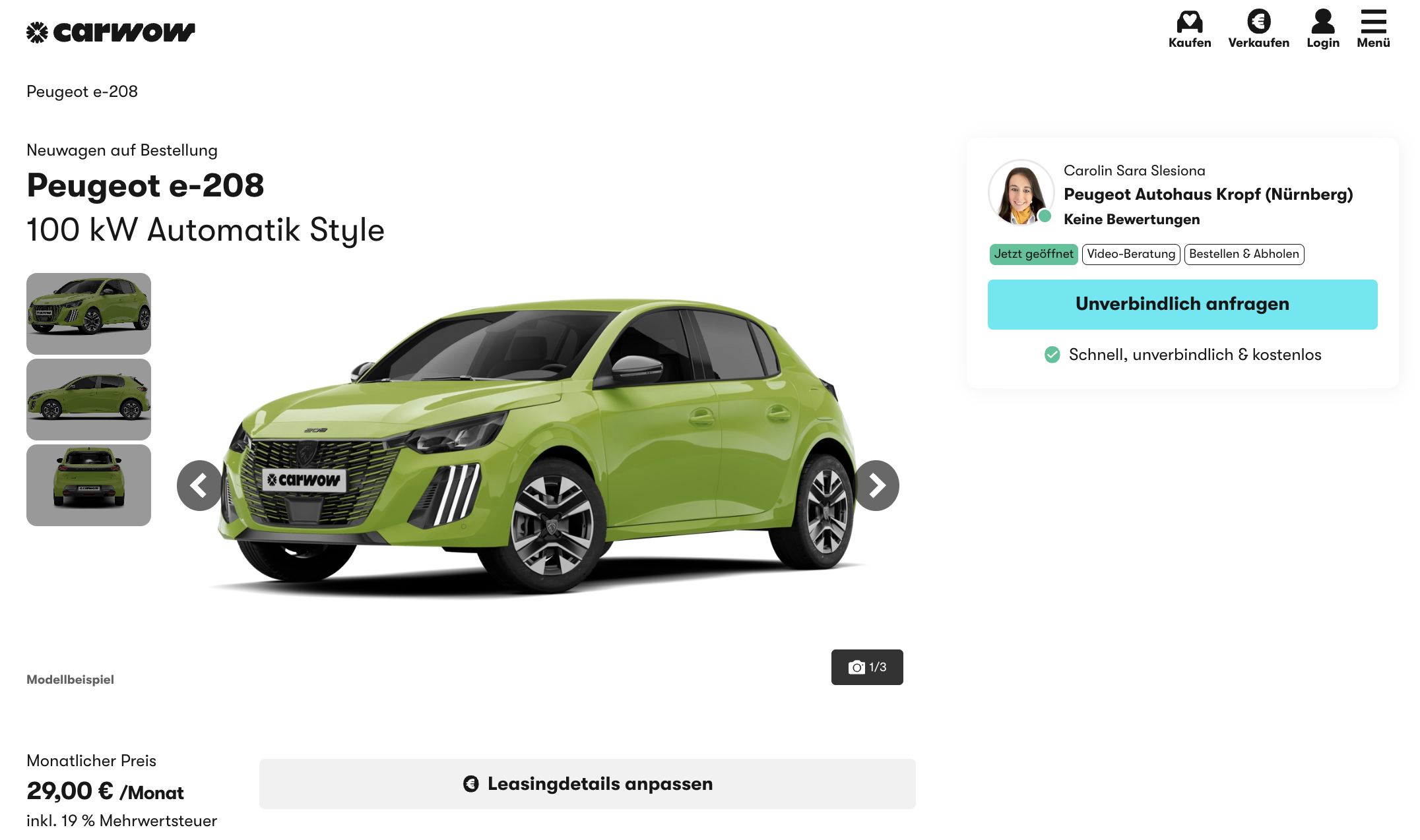 Einfacher als mit diesem Peugeot wird Elektro nicht. Der Peugeot e-208 136 Style kostet aktuell bei carwow nur 29 Euro brutto im Monat. Möglich wird diese extrem niedrige Rate durch eine erstattungsfähige Anzahlung von 6.000 Euro, die im Rahmen der neuen Umweltprämie angesetzt wird. Lieferzeit: circa drei Monate.