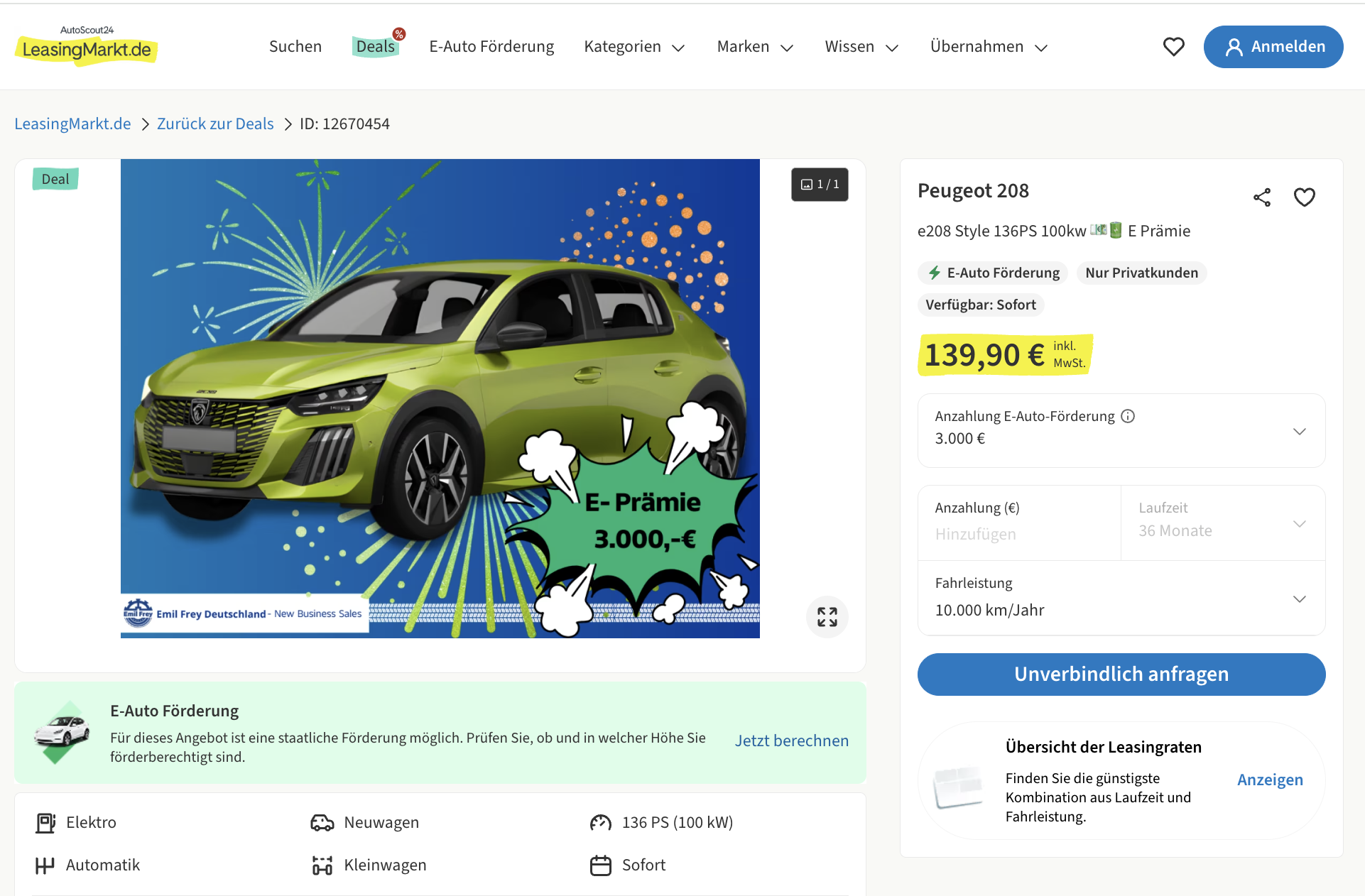 Der Peugeot e-208 ist einer der spannendsten Elektro-Kleinwagen für den Alltag. Peugeot e-208 136 Style bei LeasingMarkt für 139,90 Euro brutto im Monat zeigt gerade sehr deutlich, wie günstig der Einstieg in die Elektromobilität inzwischen ausfallen kann. Grundlage für diese auffallend niedrige Rate ist eine erstattungsfähige Sonderzahlung von 3.000 Euro, die im Rahmen der neuen Umweltprämie angesetzt wird. Dadurch entsteht ein Angebot, das auf den ersten Blick extrem günstig wirkt, auf den zweiten aber ebenfalls Substanz hat. Rechnet man die Prämie sauber auf die Laufzeit um, ergibt sich eine normalisierte Leasingrate von 223,23 Euro brutto pro Monat. Genau diese Zahl macht den Deal interessant, weil sie den echten Monatswert deutlich realistischer abbildet.