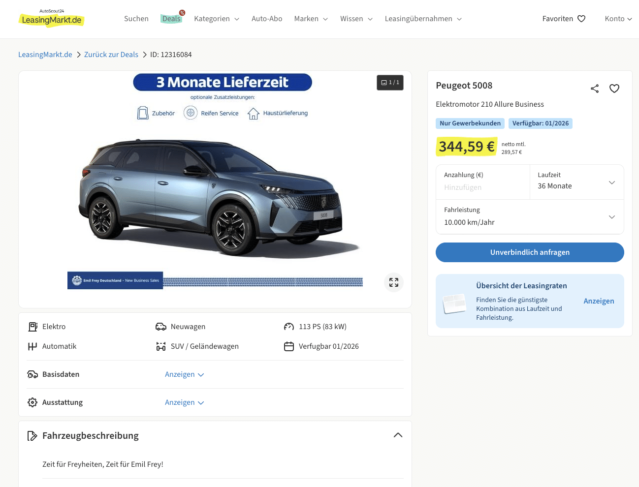 Vollelektrisches Flaggschiff aus dem Hause Peugeot bei LeasingMarkt. Angeboten wird der Peugeot 5008 „Elektromotor 210“ in Allure Business im Geschäftsleasing für 289,57 Euro netto pro Monat. Das Fahrzeug ist vorkonfiguriert und kann in der Farbe angepasst werden. Eine Wunschlackierung gibt es für 7,00 Euro/Monat. Eine zusätzliche Anhängerkupplung gibt es bereits für 7 Euro/Monat. Die Lieferzeit für das Fahrzeug beträgt drei Monaten.