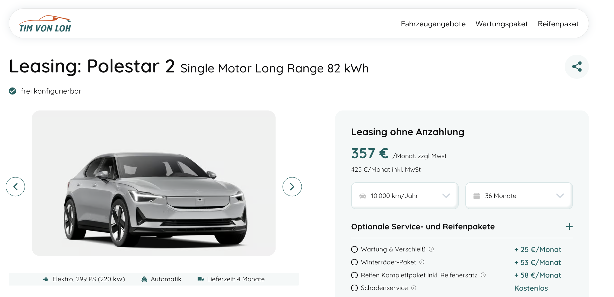 Polestar 2 im Leasing als Bestellfahrzeug für 357 Euro im Monat netto