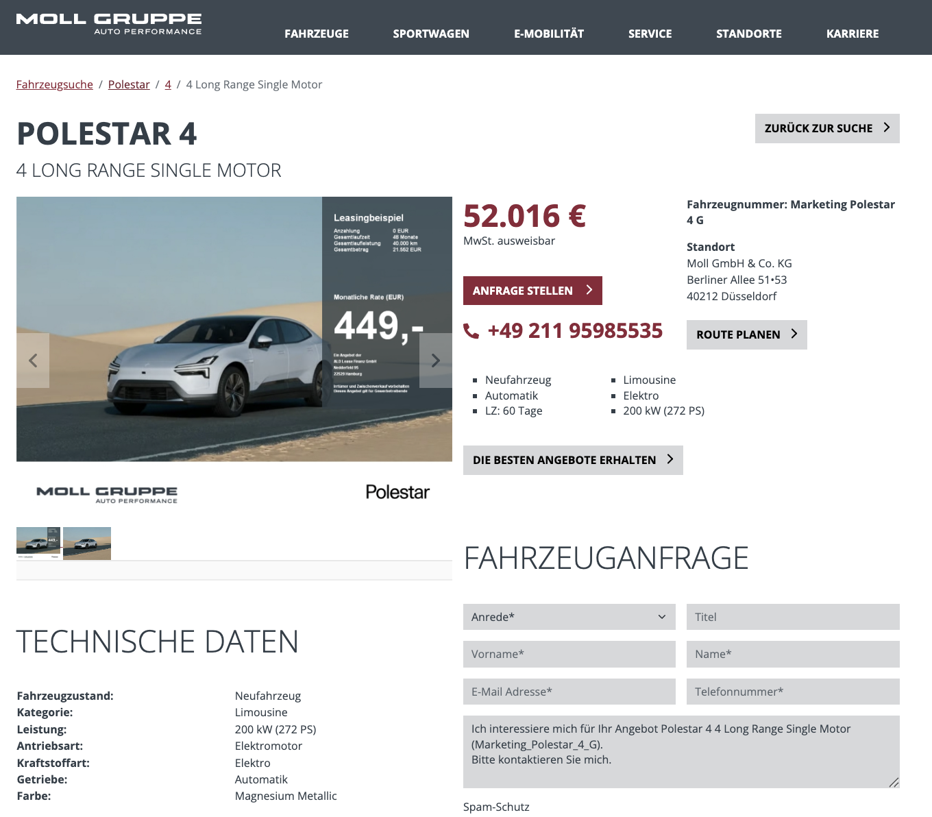 Der Polestar 4 richtet sich an alle, die ein elektrisches Fahrzeug nicht nur für Kurzstrecken sehen, sondern als Daily Driver, auch für Pendelwege und längere Etappen. Polestar 4 Long Range Single Motor bei Autohaus Moll für 449 Euro netto pro Monat ist das Geschäftskunden-Angebot, kalkuliert mit 48 Monaten Laufzeit und 10.000 Kilometern pro Jahr. Grundlage ist eine Bestellaktion, das Fahrzeug wird individuell konfiguriert, sodass Farbe, Ausstattung und Pakete passend zum eigenen Alltag gewählt werden können.