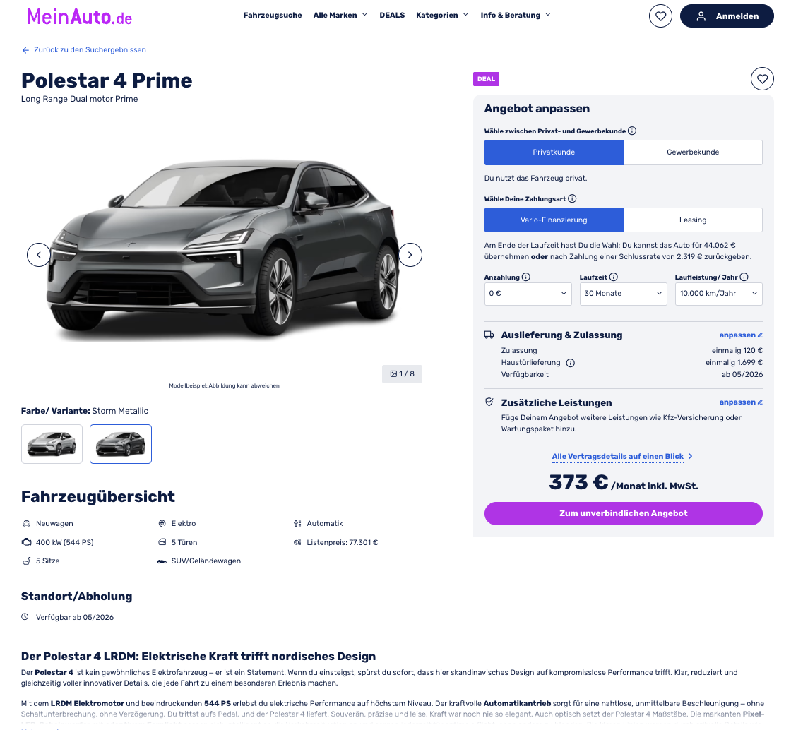 Der Polestar 4 positioniert sich als leistungsstarkes Elektrofahrzeug mit hochwertiger Ausstattung und klarer Linienführung. Polestar 4 Long Range Dual Motor Prime bei MeinAuto für 373 Euro brutto pro Monat im Vario Leasing bildet die Basis dieses Angebots. Alternativ steht das klassische Leasing mit 448 Euro brutto monatlich zur Verfügung. Das Fahrzeug ist bereits bestellt und soll ab Mai 2026 in Storm Metallic oder Magnesium Metallic verfügbar sein. Am Laufzeitende besteht die Wahl zwischen Übernahme für 44.062 Euro oder Rückgabe gegen eine Schlussrate von 2.319 Euro. Wer diese Flexibilität nicht benötigt, kann auf das klassische Leasing für 448 Euro brutto zurückgreifen.