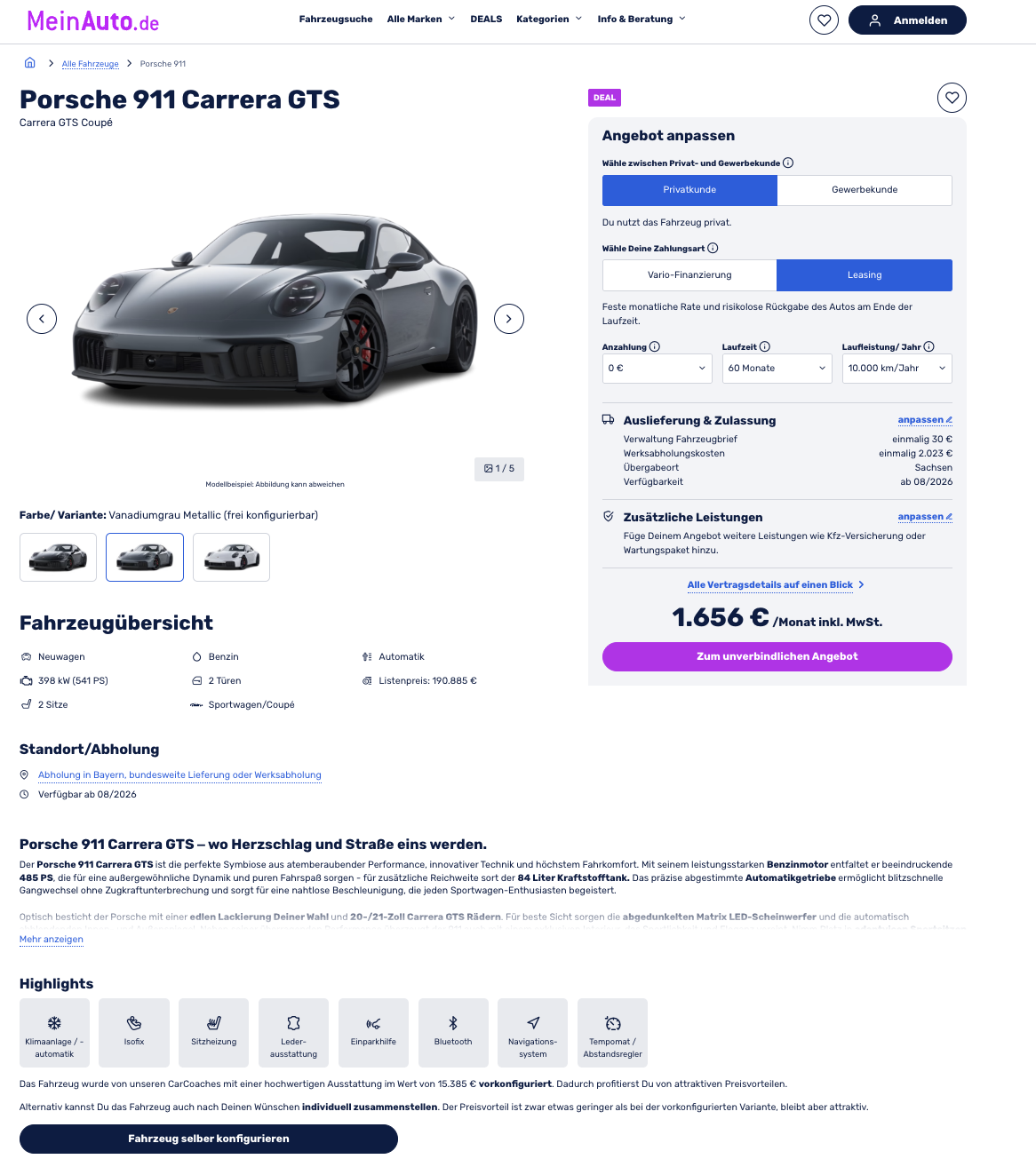 Das Angebot ist auf 60 Monate und 10.000 Kilometer pro Jahr gerechnet. Im Vergleich wirkt die Rate umso interessanter, denn ein vergleichbarer Porsche 911 Carrera GTS Coupé liegt beim Marktführer laut Angabe bei 2.007 Euro brutto im Monat. Wer einen 911 nicht nur als Traum, sondern als realistischen Plan betrachtet, bekommt hier eine sauber kalkulierte Möglichkeit, den Carrera GTS in einer sehr starken Ausstattung zu fahren.