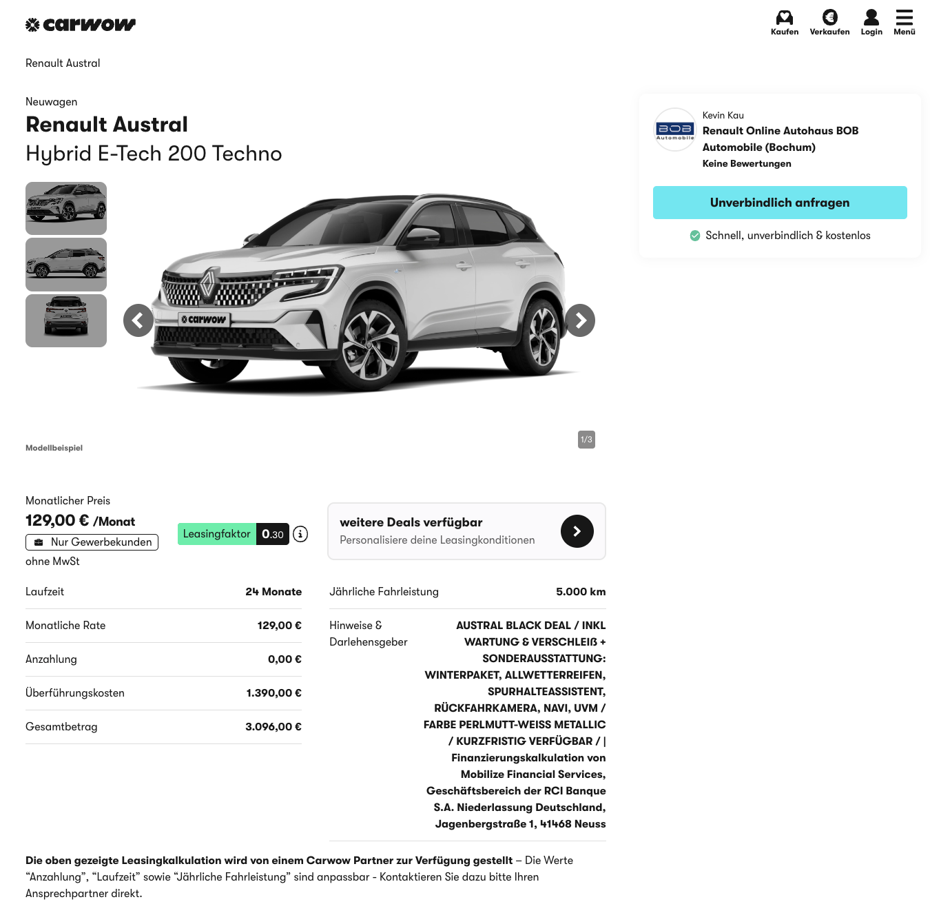 Der Renault Austral Hybrid E-Tech 200 Techno steht bei carwow für 129 Euro netto pro Monat im Geschäftsleasing bereit, inklusive Wartung und Verschleiß, kurzfristig verfügbar und in Perlmutt-Weiß Metallic erhältlich.