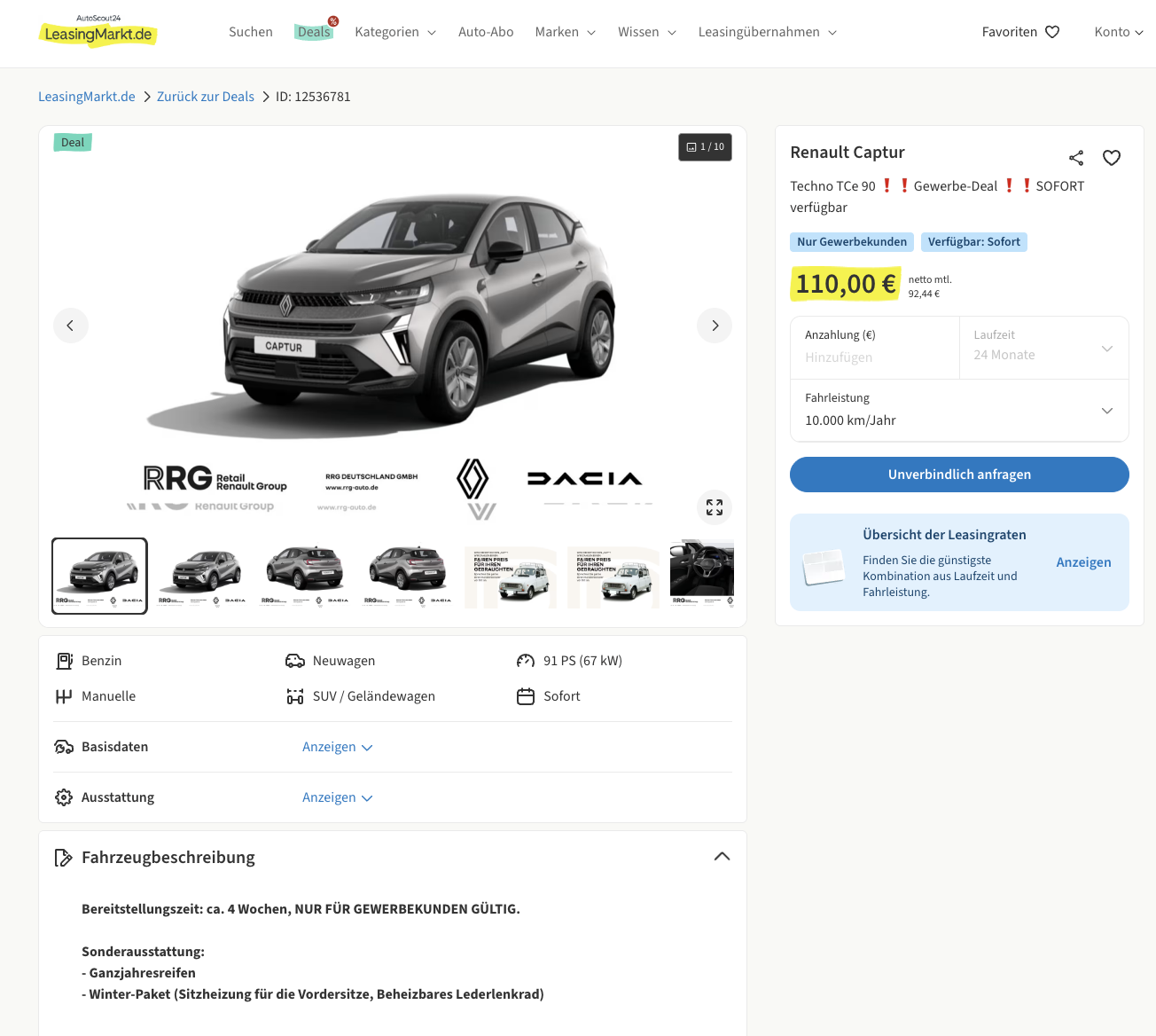 Renault Captur im Leasing als Lagerwagen für 92 Euro im Monat netto