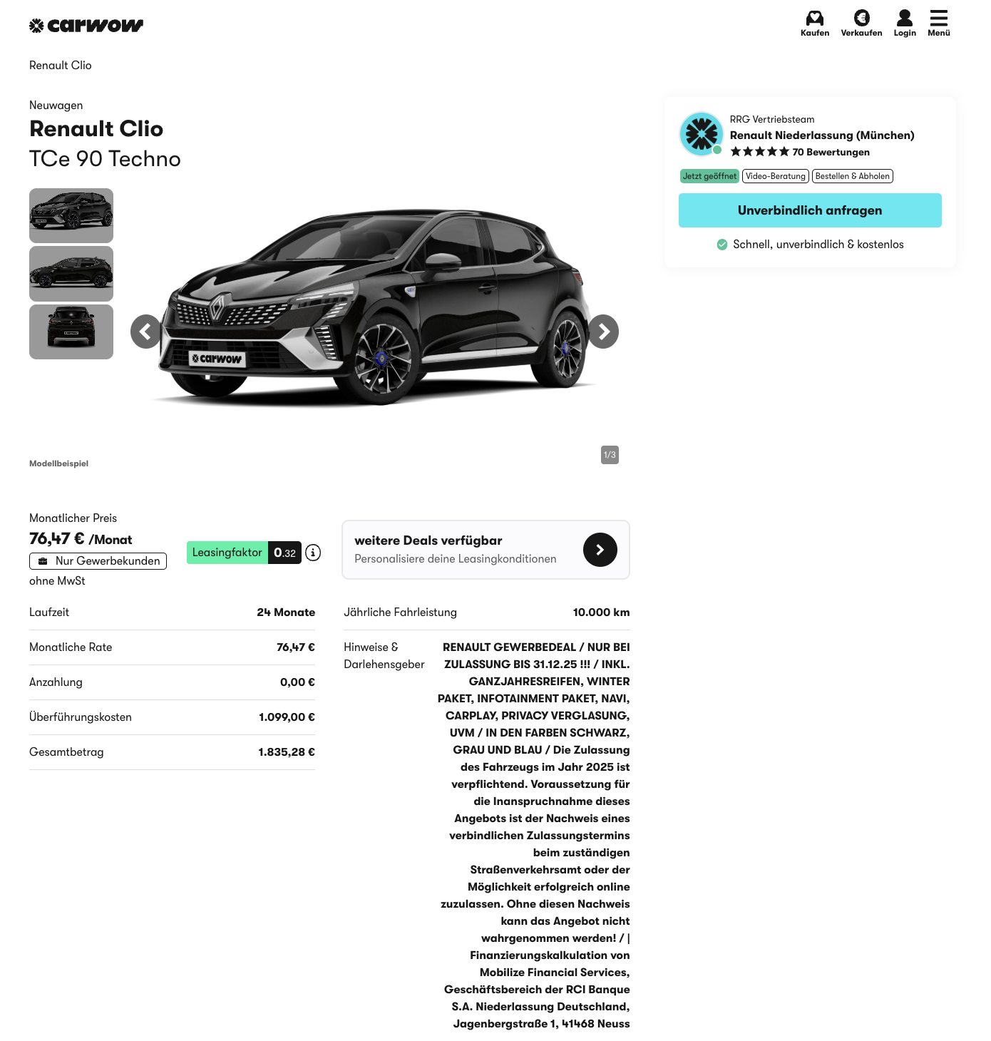 Das Angebot ist auf 24 Monate Laufzeit und 10.000 Kilometer pro Jahr kalkuliert. Beim Platzhirsch ist der Clio mit TCe 90 aktuell nicht mehr im Programm, bei carwow steht er dagegen mit klaren Zahlen und kurzer Entscheidungsfrist im Schaufenster.