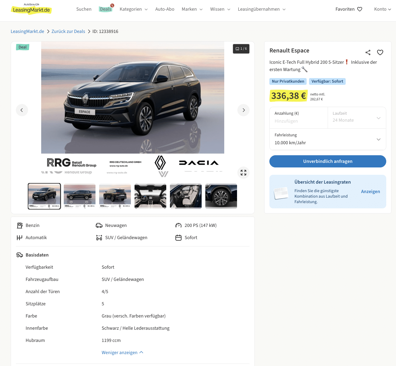 Bei LeasingMarkt steht der Renault Espace Full Hybrid E-Tech 200 als 5-Sitzer Iconic im Privatleasing für 336,38 Euro brutto pro Monat bereit. Es handelt sich um einen sofort verfügbaren Lagerwagen, verschiedene Lacke sind am Start, darunter Baltikum-Grau Metallic. Wer viel Raum, einen kultivierten Antrieb und ein ruhiges Fahrgefühl sucht, bekommt hier ein Paket, das auf Anhieb passt.