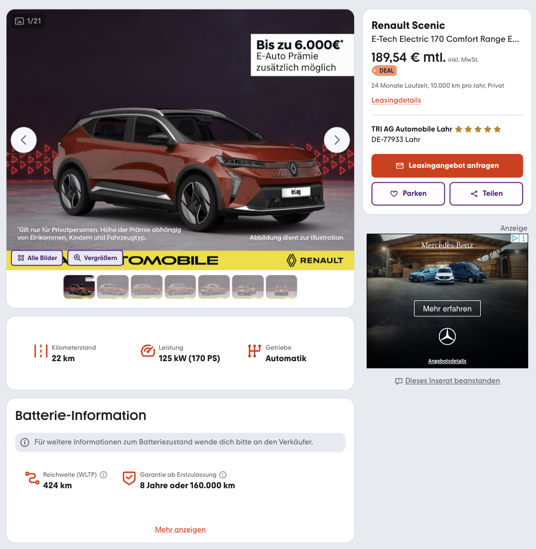 Der Renault Scénic E-Tech Electric steht für moderne Elektromobilität im familientauglichen SUV-Format. Renault Scénic E-Tech Electric 170 Comfort Range Evolution bei mobile.de für 189,54 Euro brutto pro Monat wird im Privatleasing als Bestellfahrzeug mit etwa drei Monaten Lieferzeit angeboten. Laut Anzeige kann zusätzlich eine Umweltprämie möglich sein, was die Wirtschaftlichkeit weiter verbessern kann.