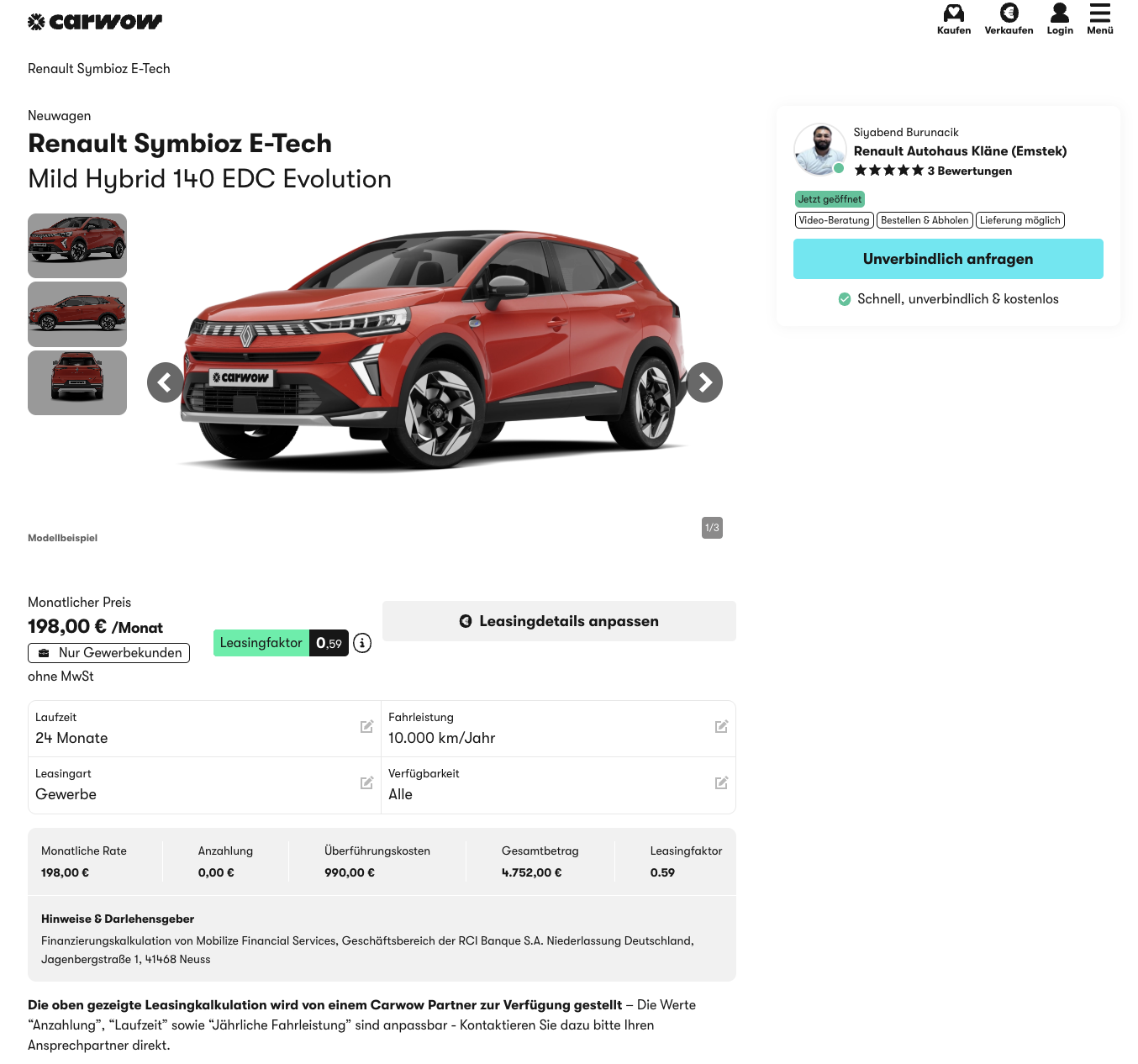 Die Kalkulation steht auf 24 Monate und 10.000 Kilometer pro Jahr, beides lässt sich flexibel an euer Profil anpassen. Und der Vergleich macht die Sache noch runder, denn wenn für den Symbioz im Markt 278 Euro netto im Monat aufgerufen werden, wirkt dieses Angebot wie ein sauberer Einstieg in ein durchdachtes SUV Konzept, Monat für Monat.