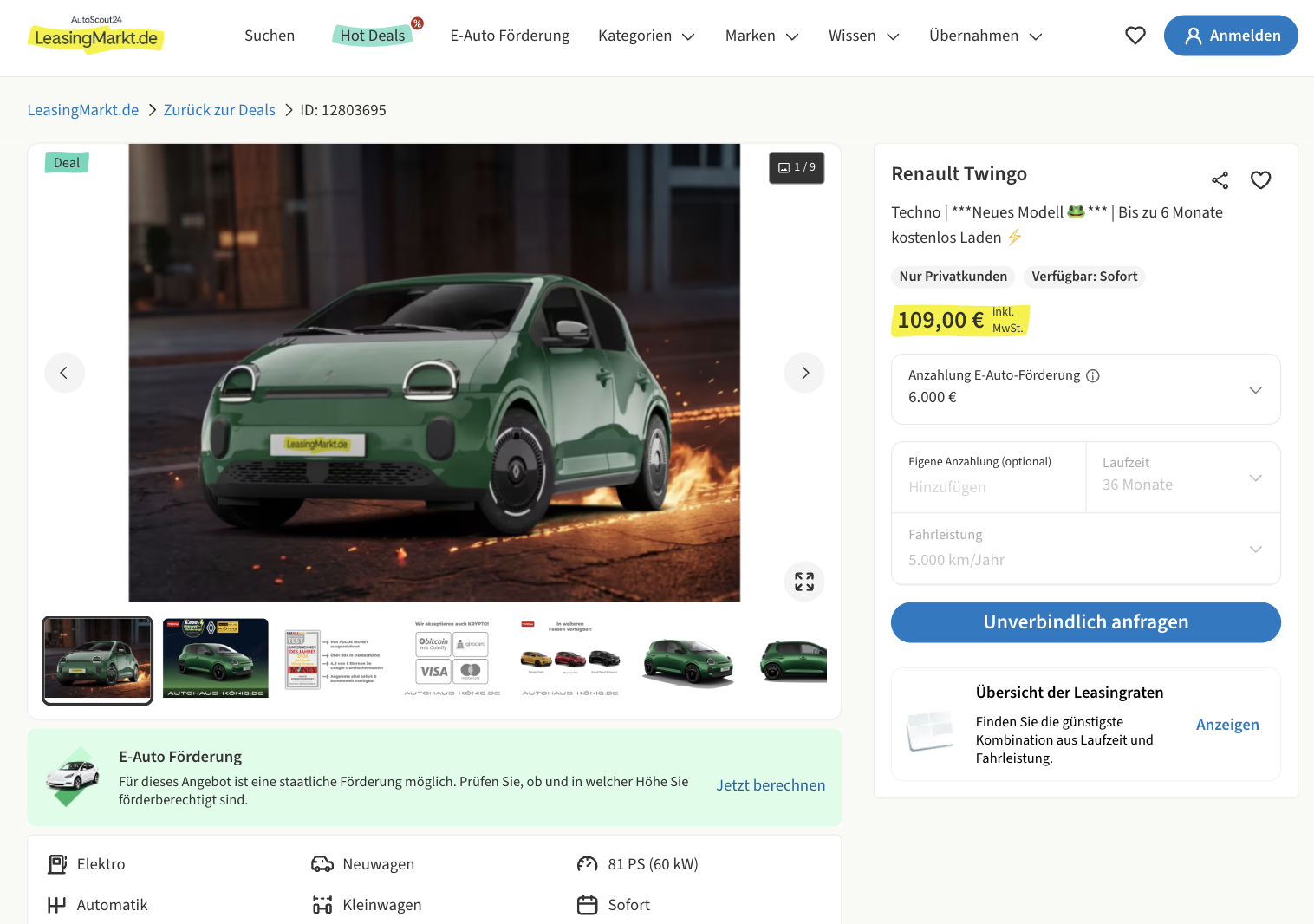 Wer die laufenden Kosten im Alltag spürbar senken will, landet früher oder später beim Thema Elektroauto. Genau an diesem Punkt wird das aktuelle Angebot interessant. Renault Twingo E-Tech 80 Urban Range Techno bei LeasingMarkt für 109 Euro brutto im Monat ist ein Deal, der vor allem für alle spannend ist, die günstig in die elektrische Mobilität wechseln möchten. Grundlage der Kalkulation ist eine Sonderzahlung von 6.000 Euro, die jedoch nicht starr festgelegt ist und angepasst werden kann. Hinzu kommt aktuell ein zusätzlicher Vorteil, denn beim Anbieter gibt es 450 Euro Ladeguthaben für vollelektrische Renault Neuwagen obendrauf. Verfügbar ist der Twingo in Mango Gelb, Absolut Rot und Black Pearl Schwarz.
