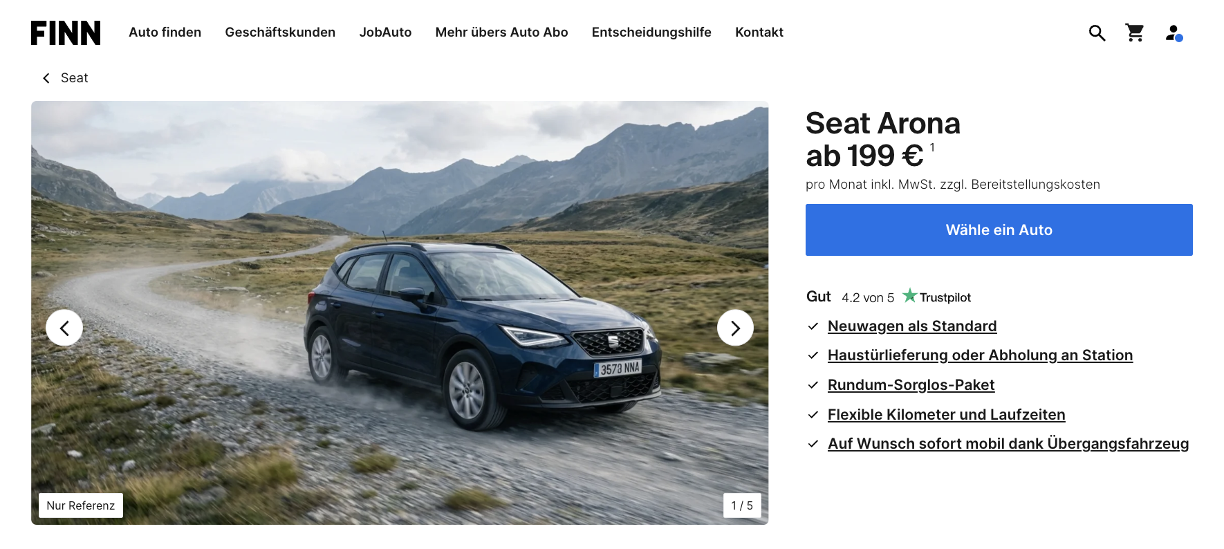 Der Seat Arona zeigt, wie unkompliziert Mobilität heute funktionieren kann. Seat Arona 1.0 TSI 70 kW Style bei FINN für 199 Euro brutto im Monat im All-inclusive Auto-Abo bringt ein kompaktes SUV ohne klassischen Leasingaufwand auf die Straße. Das Fahrzeug ist ab Ende Mai verfügbar, wer lieber Automatik fährt, kann zur DSG-Version für 219 Euro monatlich greifen.