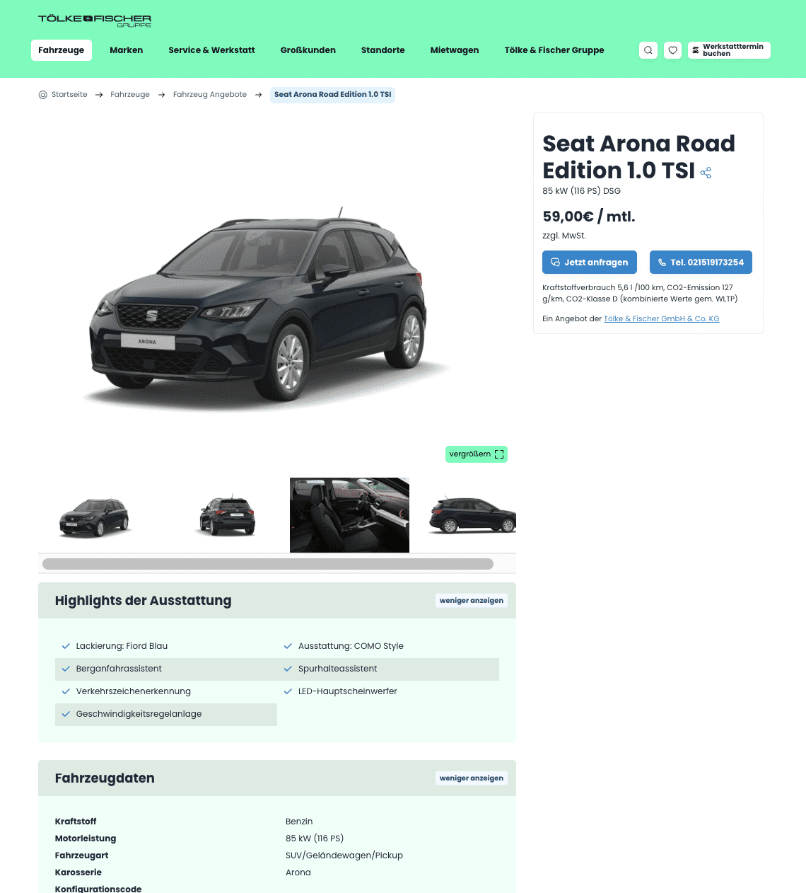 Tölke+Fischer setzt ein klares Signal für smarte Fuhrparkentscheider! Der Seat Arona 1.0 TSI 85 kW DSG Road Edition startet ab 59 € netto im Monat, kalkuliert mit 990 € Sonderzahlung und der Loyalitätsprämie. Die Regel ist einfach: Wer seit mindestens sechs Monaten einen SEAT oder CUPRA (gekauft, geleast oder finanziert) fährt, qualifiziert sich und profitiert. Ohne Anzahlung liegt die Musterkondition bei 100,25 € netto/Monat. Es handelt sich um ein frei konfigurierbares Bestellfahrzeug, Lack, Felgen, Pakete, Assistenz: Ihr entscheidet, was in euren Alltag passt. Die Basis: 24 Monate Laufzeit, 10.000 km/Jahr.