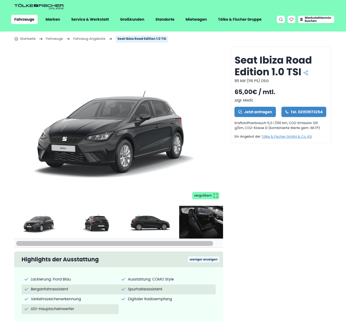 Bei Tölke+Fischer wartet gerade euer City-Upgrade auf vier Rädern, der Seat Ibiza 1.0 TSI 85 kW DSG Road Edition steht dort für 65 Euro netto pro Monat, kalkuliert mit 990 Euro Sonderzahlung, 24 Monaten Laufzeit und 10.000 Kilometern pro Jahr, als frei konfigurierbares Bestellfahrzeug. Das Angebot läuft als Loyalisierungsdeal für alle, die seit mindestens sechs Monaten einen SEAT oder CUPRA zugelassen haben, wer diese Voraussetzung nicht erfüllt, bekommt laut Autohaus auf Anfrage dennoch ein attraktives Alternativpaket. Damit ist der Einstieg klar, die Details machen den Unterschied.