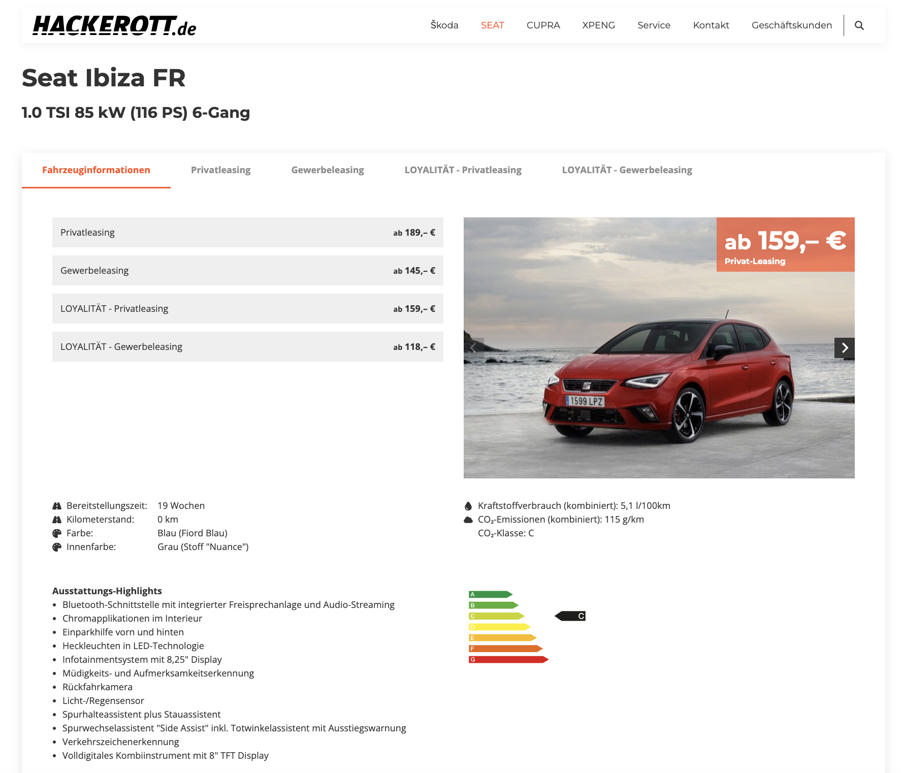 Loyalitätsdeal für den Alltagssportler. Treue zur Marke lohnt sich, vor allem in der Kleinwagenklasse. Der Seat Ibiza 1.0 TSI 85 kW 6 Gang FR steht bei Hackerott für 159 Euro brutto im Monat im Privatleasing bereit, wenn bereits ein Seat oder Cupra seit mindestens sechs Monaten auf euch zugelassen ist. Das Angebot läuft über 24 Monate mit 10.000 Kilometern im Jahr, der Ibiza wird als frei konfigurierbares Bestellfahrzeug ausgeliefert, sodass Lack, Felgen und Extras genau zu eurem Geschmack passen. Ohne Loyalitätsprämie läge die Rate bei 189 Euro im Monat bei 48 Monaten Laufzeit, treue Geschäftskunden steigen mit 118 Euro netto ein. Der Vergleich mit dem Platzhirsch zeigt den Vorteil deutlich, dort bewegen sich ähnliche Ibiza Angebote bei rund 215 Euro brutto pro Monat.